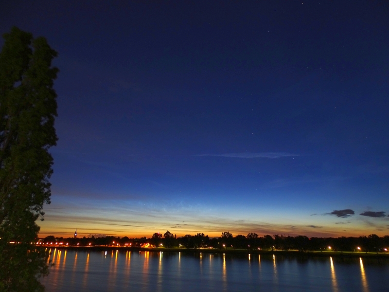 nachstehend 3 Belegfotos aus Bonn, aufgenommen um 03:31 MESZ (Sonnenstand -11.7°), 03:33 MESZ (Sonnenstand -11.6°) und 03:35 MESZ (Sonnenstand -11.4°). Aus dem Übersichtsfoto ergibt sich eine azimuthale Erstreckung von 356 - 28° bei einer Elevation von 9°. Hinter der Pappel ging es nicht mehr wirklich weiter, wie ich (visuell) aus einer anderen Position sehen konnte. Als ich um 03:22 MESZ am Beobachtungsort (Bonner Rheinufer) ankam, waren die NLCs allenfalls erahnbar, aber 2 Minuten später fotografisch einwandfrei nachweisbar. Sie wurden bis etwa 03:50 MESZ allmählich heller (maximal Stufe 2), um danach rasch in der fortschreitenden Dämmerung zu verblassen; bereits um 03:57 MESZ, als ich den Standort verließ, war mit bloßem Auge nur noch eine kleine Partie links von Kapella erkennbar. Während des gesamten Beobachtungszeitraums war das Display in Azimuth und Höhe stabil, sodass hier mit Sicherheit der wahre Südrand des Feldes zu sehen war.