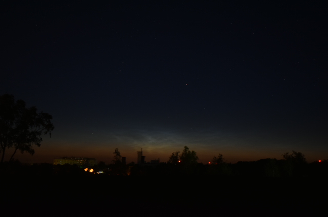 Wegen des späten Echos bin ich schon gegen 22:15 zu " meinem" Beobachtungsplatz gelaufen. Um 23:10 MESZ konnte ich die ersten schwachen NLCs fotografisch festhalten.