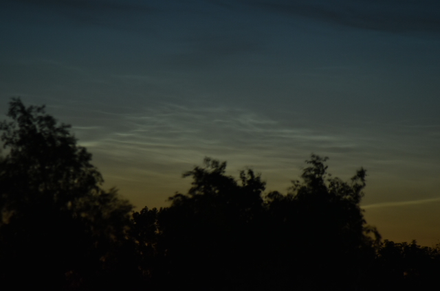 Wir waren auf dem Heimweg von Bekannten südlich von Magdeburg, bei denen ich ab und zu über den Zaun in nördliche Richtung geguckt hatte - nichts auffallendes. Beim Aufbiegen auf die Schnellstraße - heller Himmel in Nordrichtung! Mein Mann als Beifahrer hatte mehr Ruhe zum Schauen und bestätigte die typischen feinen Strukturen der NLC. Da ich zwar meine Kamera dabei hatte, aber kein Stativ