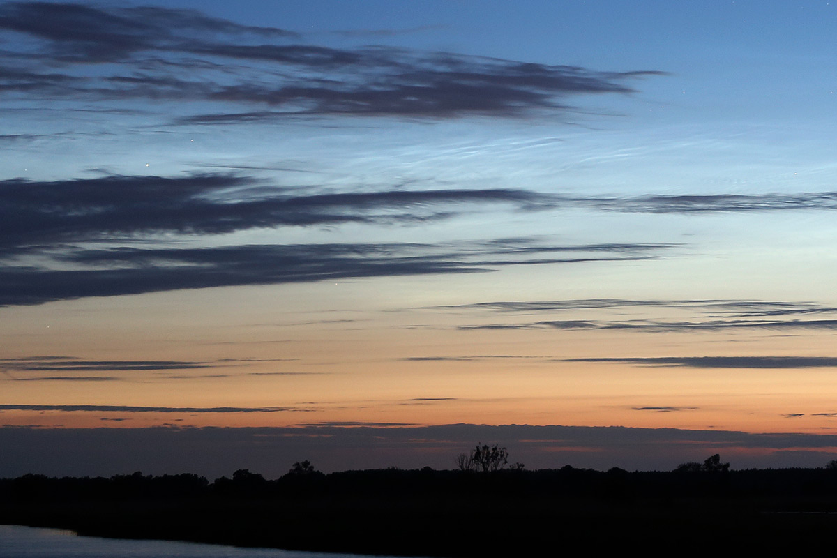 Ich kann die NLC visuell und fotografisch bestätigen. Ich war auf den Bildern der IAP Kameras eher skeptisch und habe schnell einen kleinen Alarmstart gemacht, dank einer gewissen Routine hat das auch wunderbar geklappt. So war ich kurze Zeit später am Flüsschen Ryck und konnte gerade noch mit ansehen, wie die NLC langsam hinter Wolken verschwanden. Ich kann daher keine Aussagen bezüglich der Größe treffen, aber sie lagen etwa auf NW-NNW.