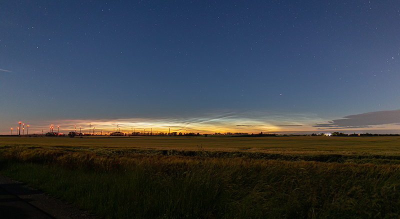 Mittlerweile ist es kurz nach Mitternacht MESZ, die NLCs sind wie meist bei fortschreitender Abenddämmerung etwas weniger in der Höhe ausgedehnt, die hellsten Partien schaffen 15 Grad, die schwächeren in nordwestlicher Richtung 20 Grad. Die azimutale Ausdehnung reicht in etwa von 300 Grad bis 20 Grad. Dafür hat die Helligkeit zugenommen, für Lübeck vergebe ich jetzt eine 5.