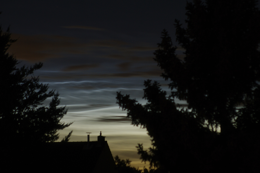 Von mir auch ein paar NLC-Bilder aus Bochum. Um kurz nach 23 Uhr sah ich noch einmal aus dem Nordfenster im Hausflur, um zu überprüfen, ob vielleicht Leuchtende Nachtwolken da wären. Nun, die Überprüfung fiel positiv aus: