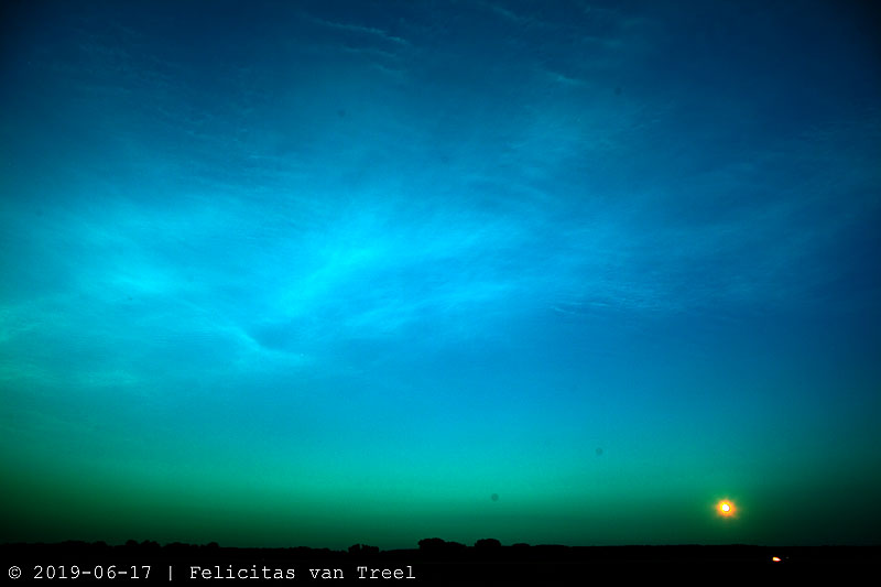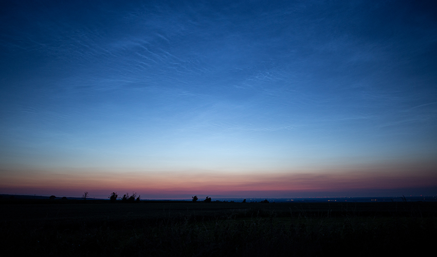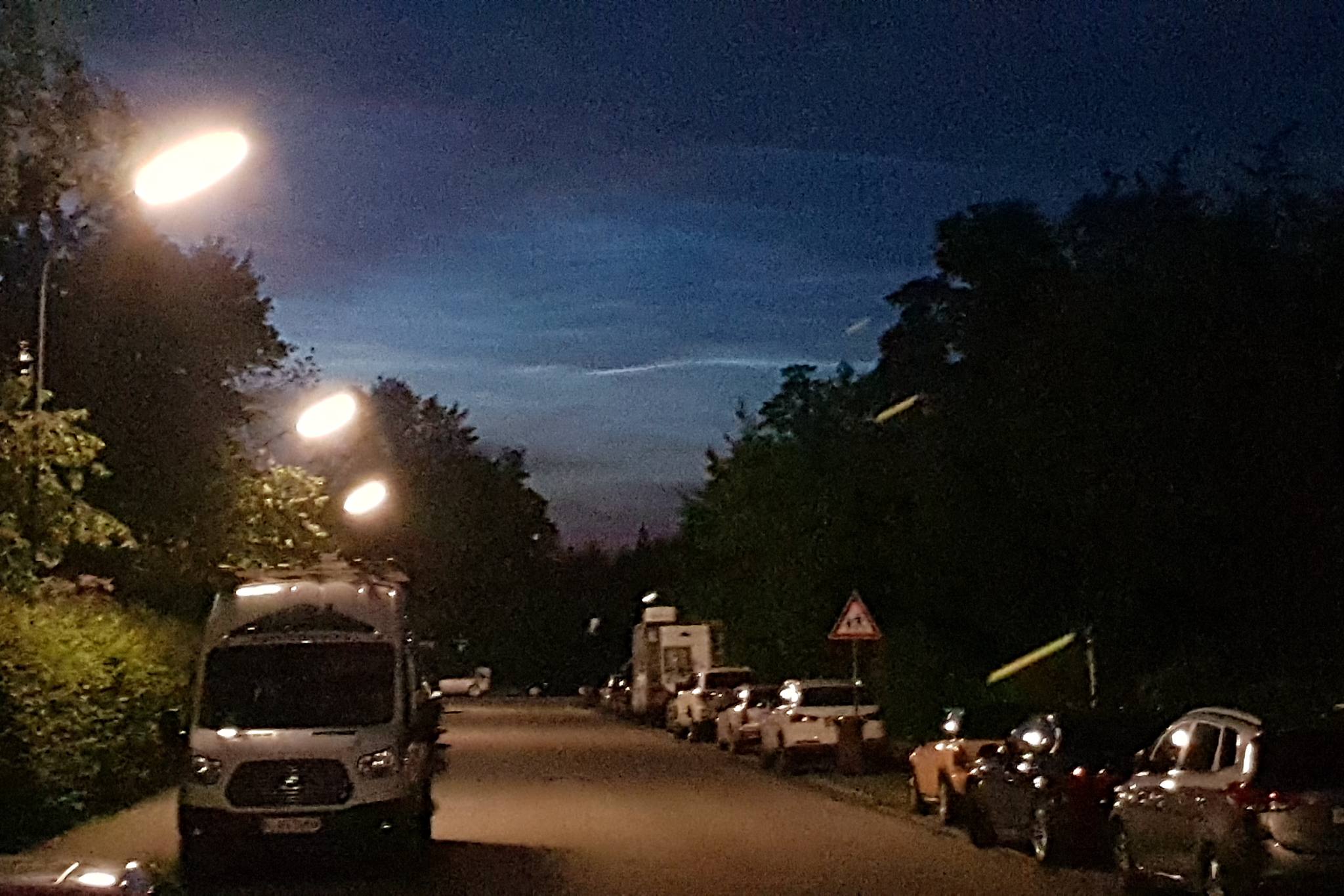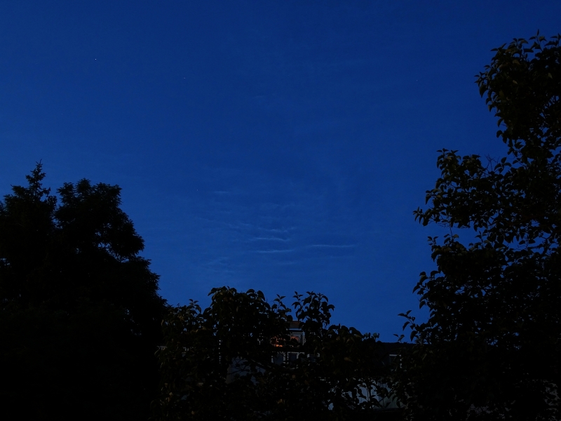 Standort Magdalenenhausen bei Wetzlar (70 kn mördlich von FFM), ca. 50.54N, 8.4E - ab ca. 22:10 - 22:15 zeichneten sich die ersten NLCs weit im Osten ab. Und zwar fast bis Vega. also 70° Nordazimut, bis fast in den Zenit. Sie drangen dann weiter in Richtung Westen vor, und standen gegen schätzungsweise 22:45 bis ca. 10° über den Zenit nach Süden!