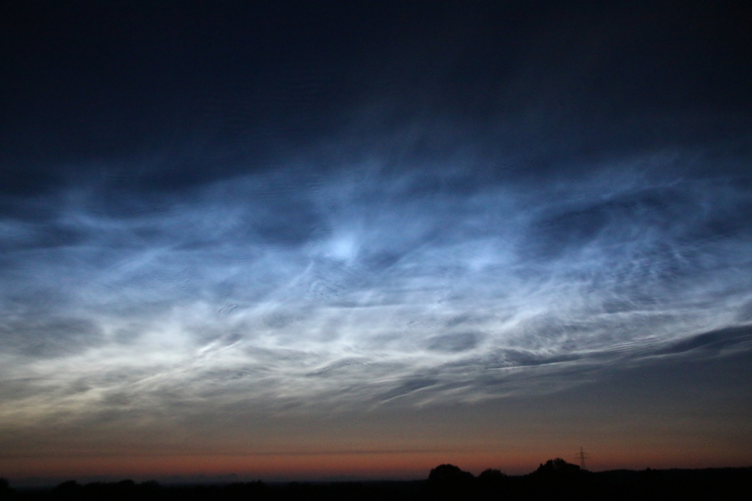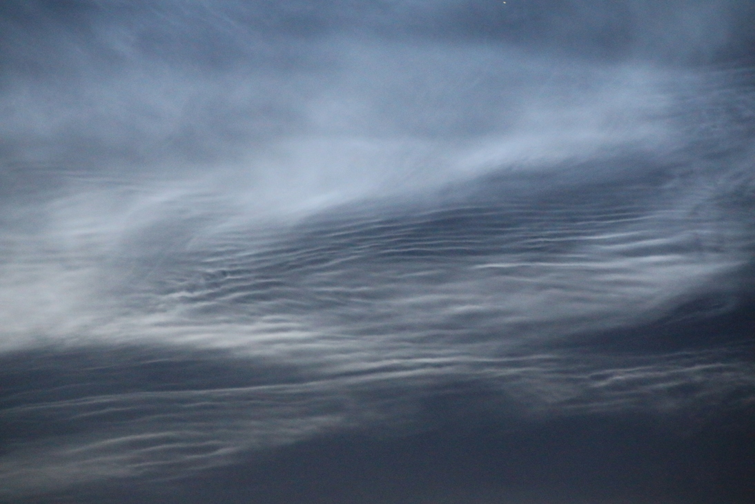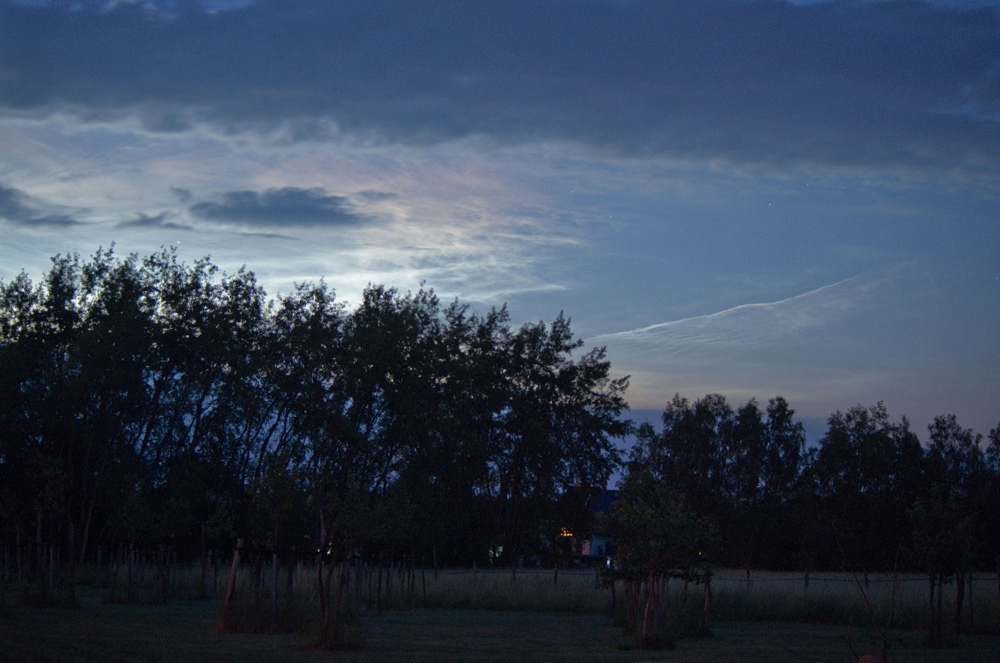 hier nun auch noch meine Fotos vom umwerfenden Abend-Display. Ich hatte Glück mit der Bewölkung und konnte einen fast klaren Himmel genießen, von dem die NLCs mit größter Helligkeit strahlten. Die ersten Bilder schoss ich von zu Hause aus. Direkt bereits in der einsetzenden Dämmerung war praktisch der gesamte Himmel von NLCs überzogen. Bis weit in den Südwesten waren die klassischen Wellenmuster erkennbar.