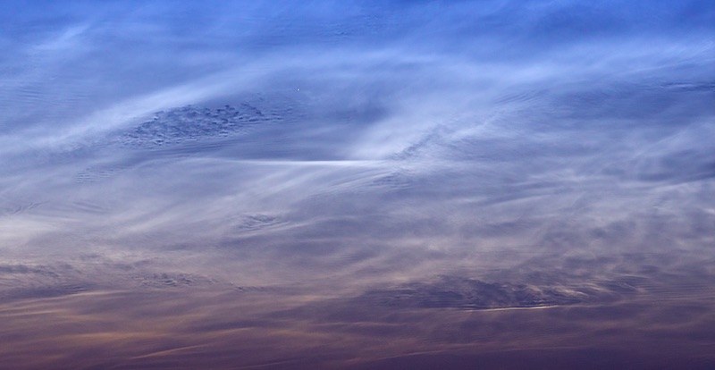 @Daniel Ricke: Vielen lieben Dank für Deine Mühe. Ich habe solche Strukturen bei NLC noch nie gesehen und bin total fasziniert! Die Entstehung der Löcher würde mich echt brennend interessieren. Bei den stratosphärischen Wolken würde solch ein Aussehen dem sog. Lacunosus entsprechen, der an Altocumulus stratiformis, Föhnwolken oder Cirrocumulus auftritt und eine Labilisierung anzeigt. Vielleicht war das auch bei den NLC der Fall, immerhin scheinen sich die Wolken bis zum Morgen ja weitgehend aufgelöst zu haben.
