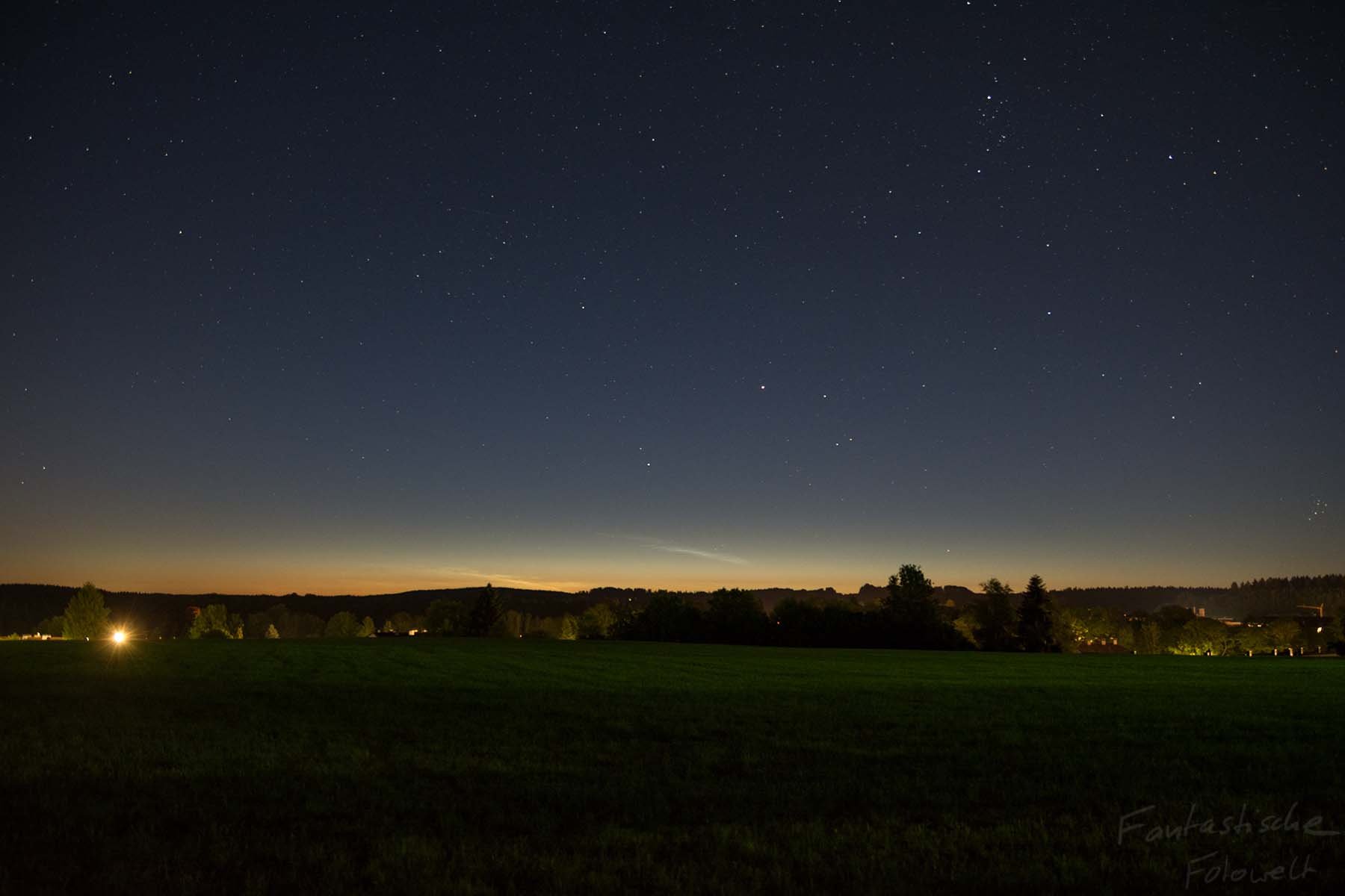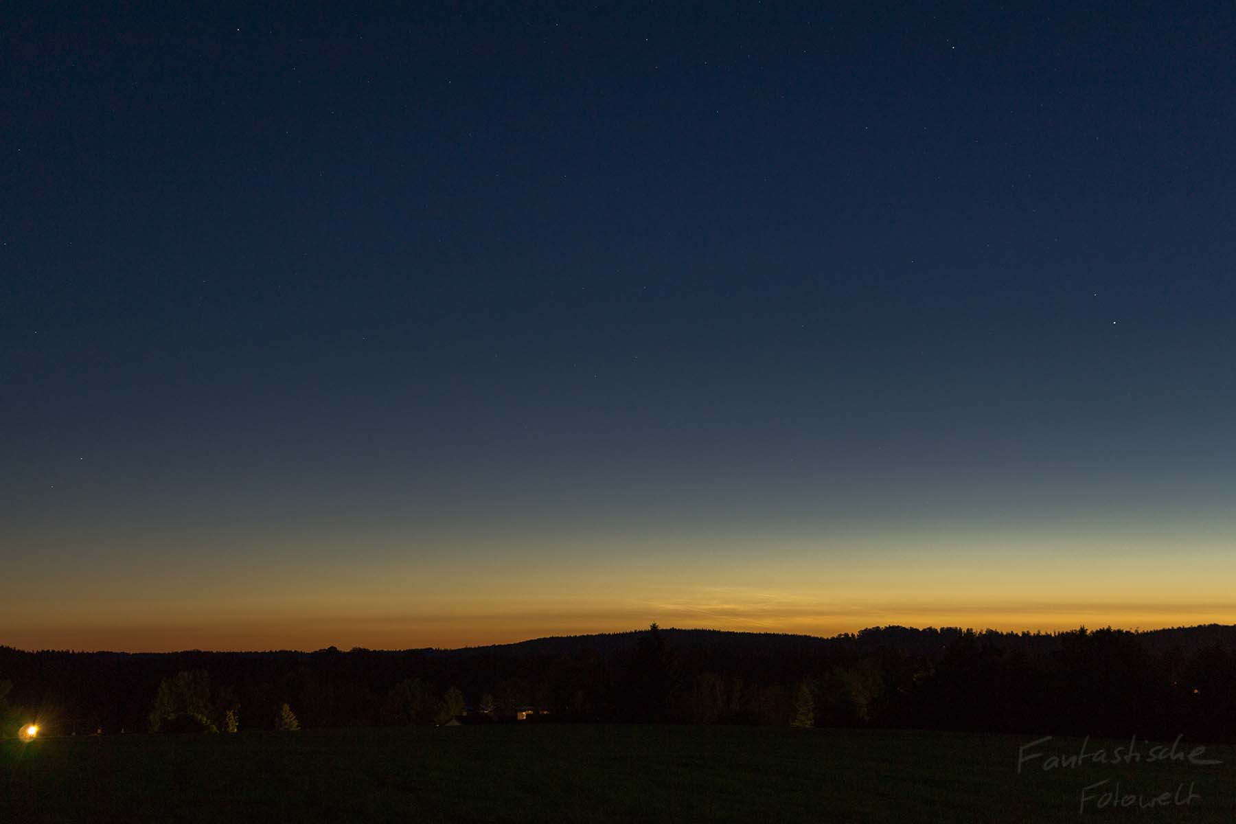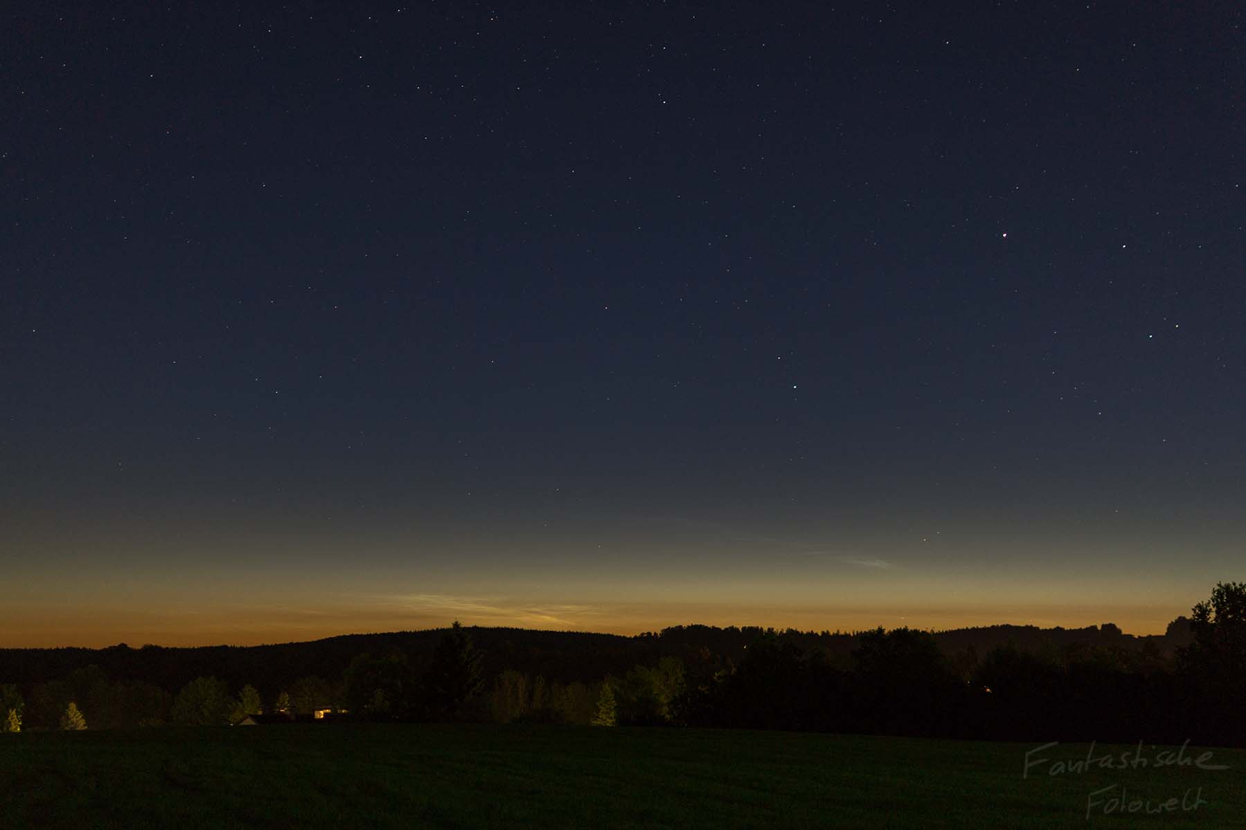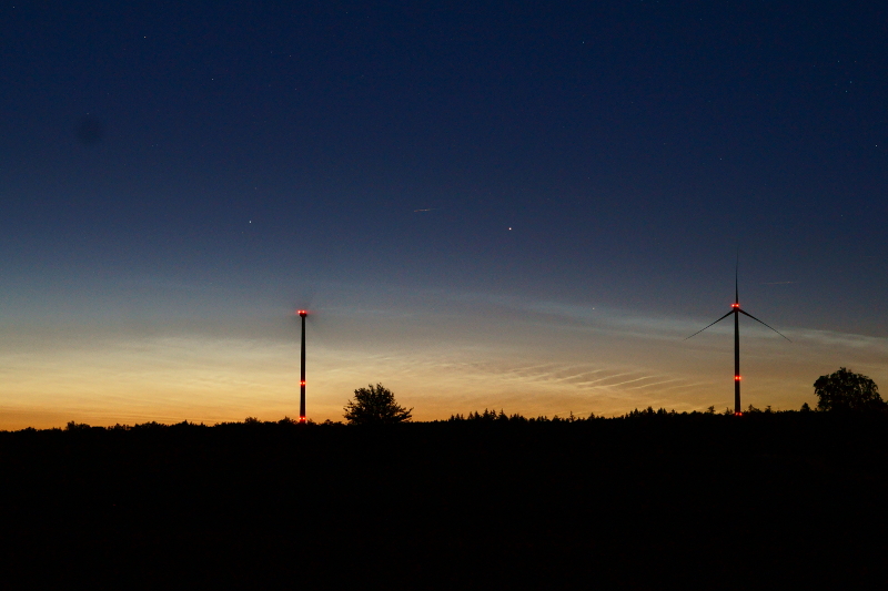 in dieser Nacht konnte ich sehr horizontnahe NLCs in Miesbach beobachten. Weder die Helligkeit, noch die Ausdehnung war nennenswert. Vermutlich waren die NLCs nur aufgrund des sehr klaren Wetters sichtbar.