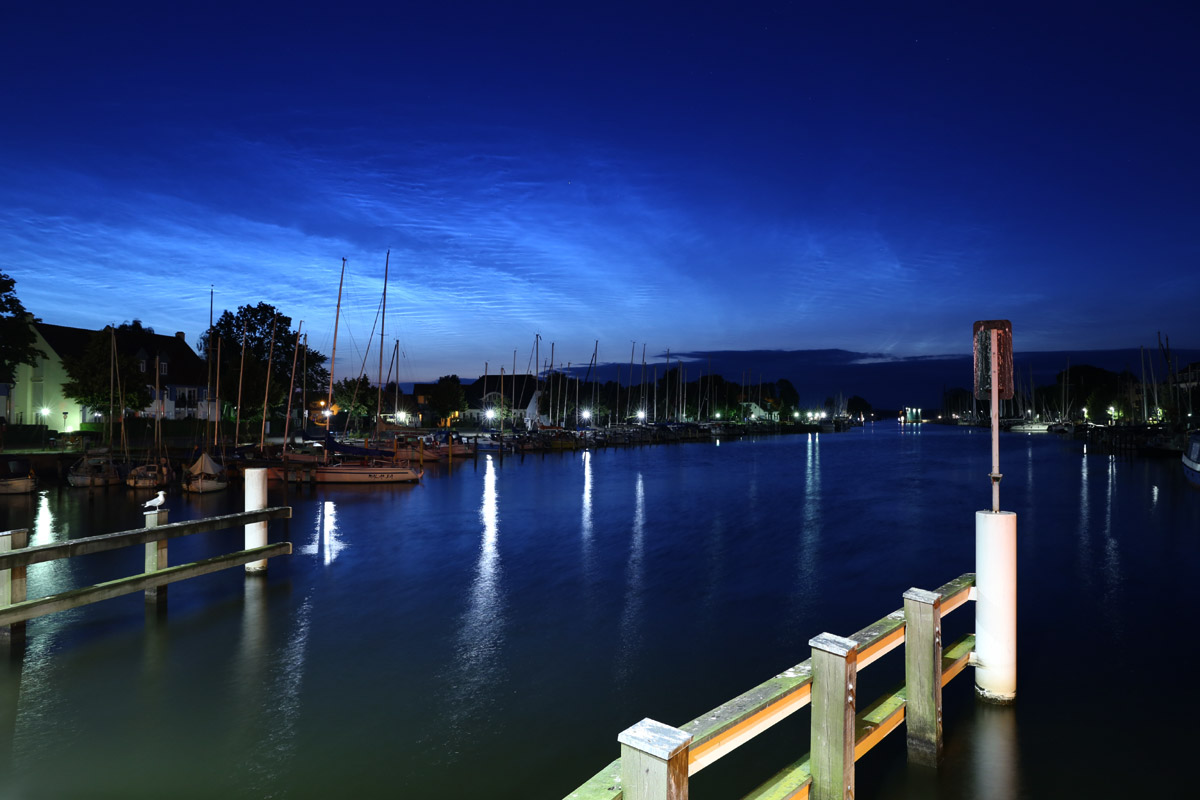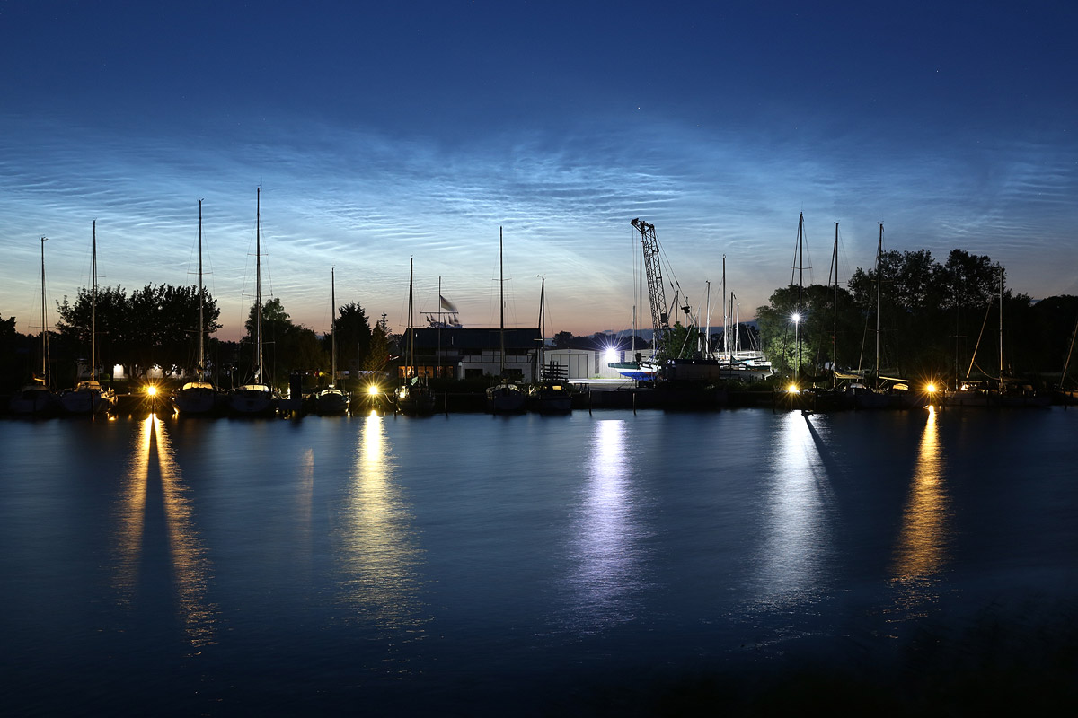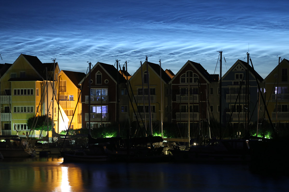 Da die NLC heute sehr schöne Muster und Strukturen aufwiesen, fuhr ich ein Stück nach Greifswald hinein, um dort Fotos vom Jachthafen mit den NLC über den Häusern zu machen. Ein Teil des NLC Feldes bildete sehr schöne Wellenmuster aus, die über den Häuserdächern in Teleaufnahmen sehr gut zur Geltung kamen, während der östliche Teil des Displays lange feine Linien ausbildete.