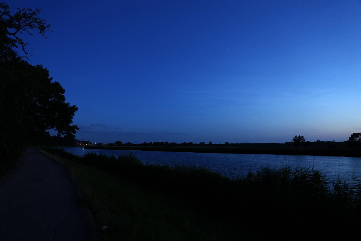 Zugleich konnte man auf den Satellitenbildern "Nature" und "Nebel Check" bei Kachelmann sehen, das es von Nordwesten her aufklart. Ich machte mich auf den Weg und durfte an meinem Beobachtungspunkt am Ryck angekommen ein Wettrennen zwischen langsam nach Osten abziehenden Wolken, der langsam steigenden Sonne und den NLC beobachten.