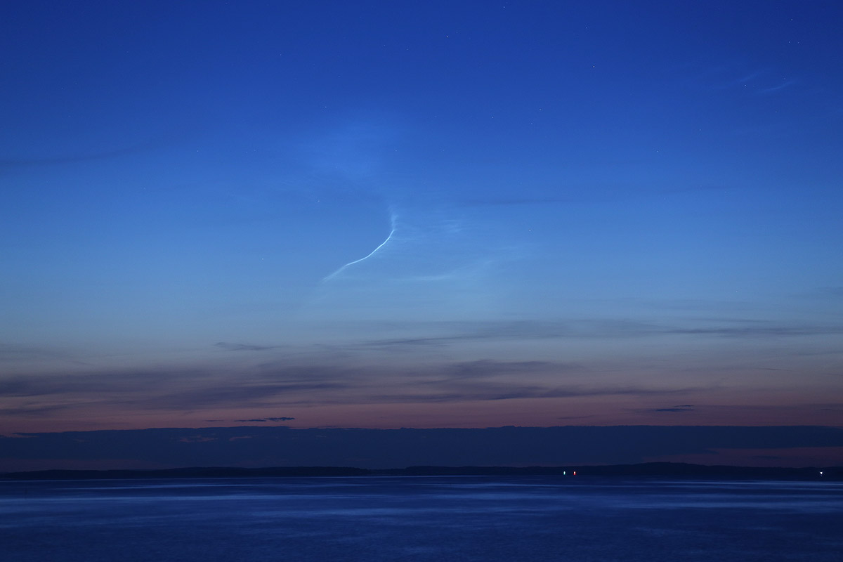 Das nächste Bild zeigt das Feld leuchtender Nachtwolken über den Inseln Koos und Rügen. Die Insel Koos ist links der kleine dunklere Teil und den drei Baumgruppen bewachsene Teil, Rügen ist dann der Rest und liegt deutlich weiter hinten.