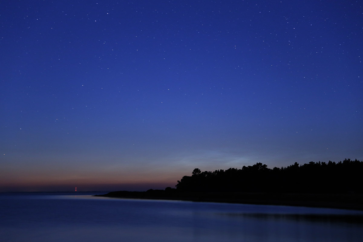 Da die NLC noch sehr schwach waren, beschloss ich ein wenig abzuwarten, Brotzeit zu machen und mich meiner Foto-Idee zu widmen. Während dessen wuchsen die NLC langsam an und wurden auch mit bloßem Auge sichtbar. Ich packte also meine Sachen zusammen und fuhr zu meinem nächsten Ziel, einem Strand etwas westlich von Bungalowsiedlung Loissin, der "schlafende Bäume" genannt wird. Dort angekommen hatte sich inzwischen ein ordentliches NLC Display entwickelt. Das Warten auf die zweite Nachthälfte hat sich also mal wieder gelohnt.