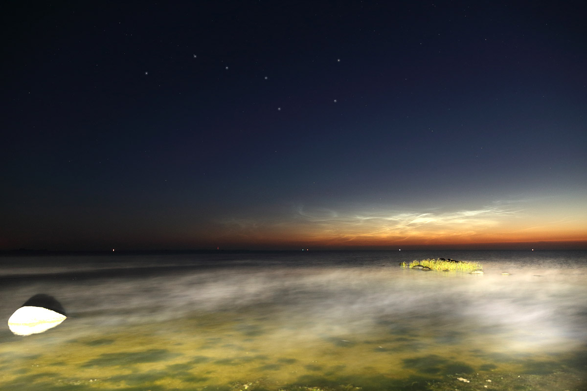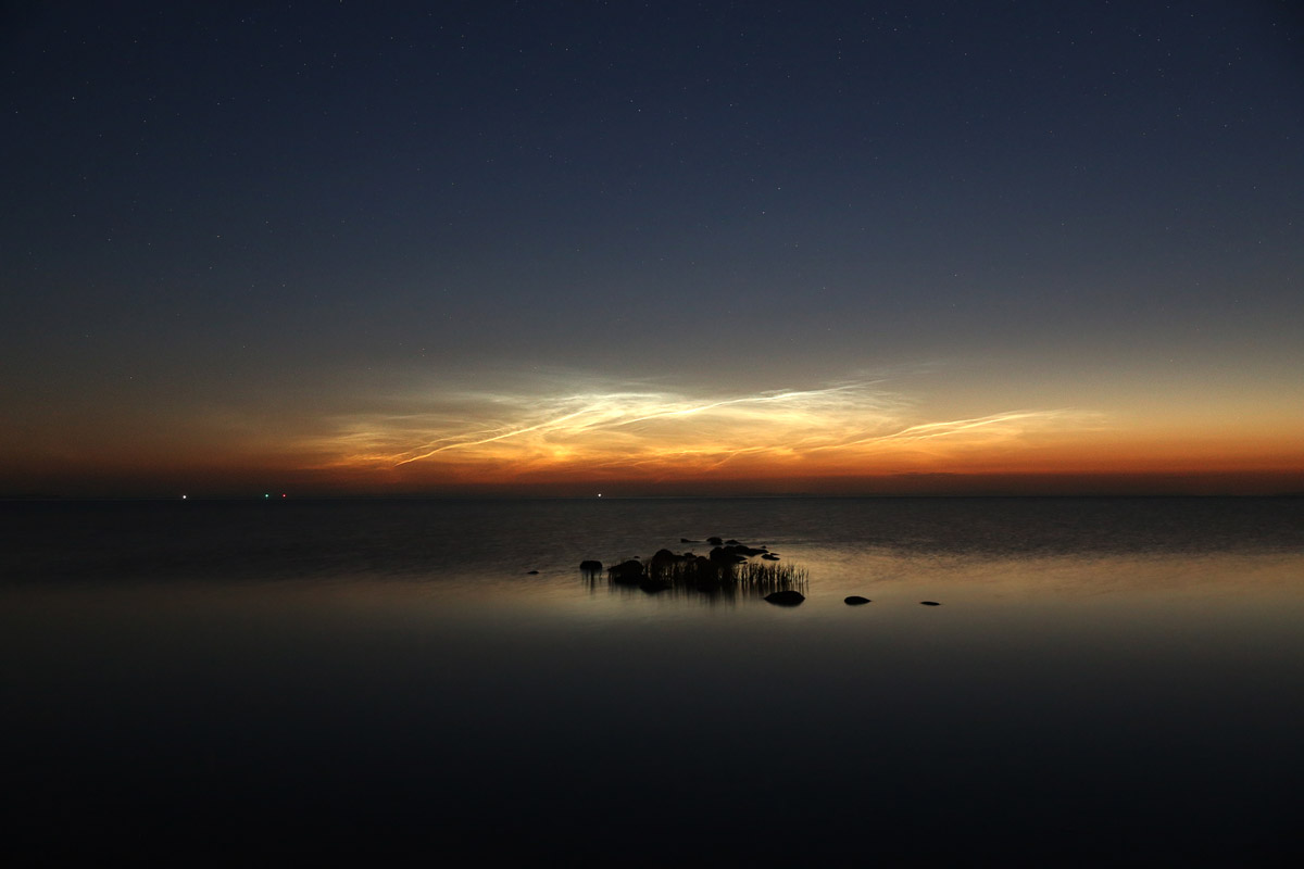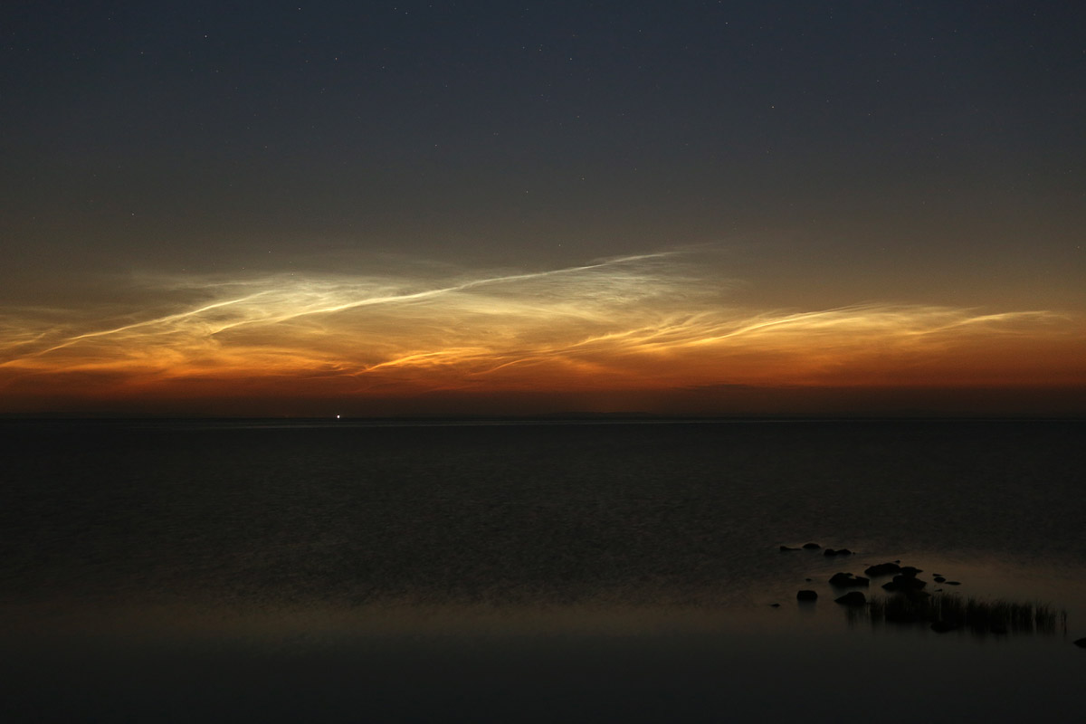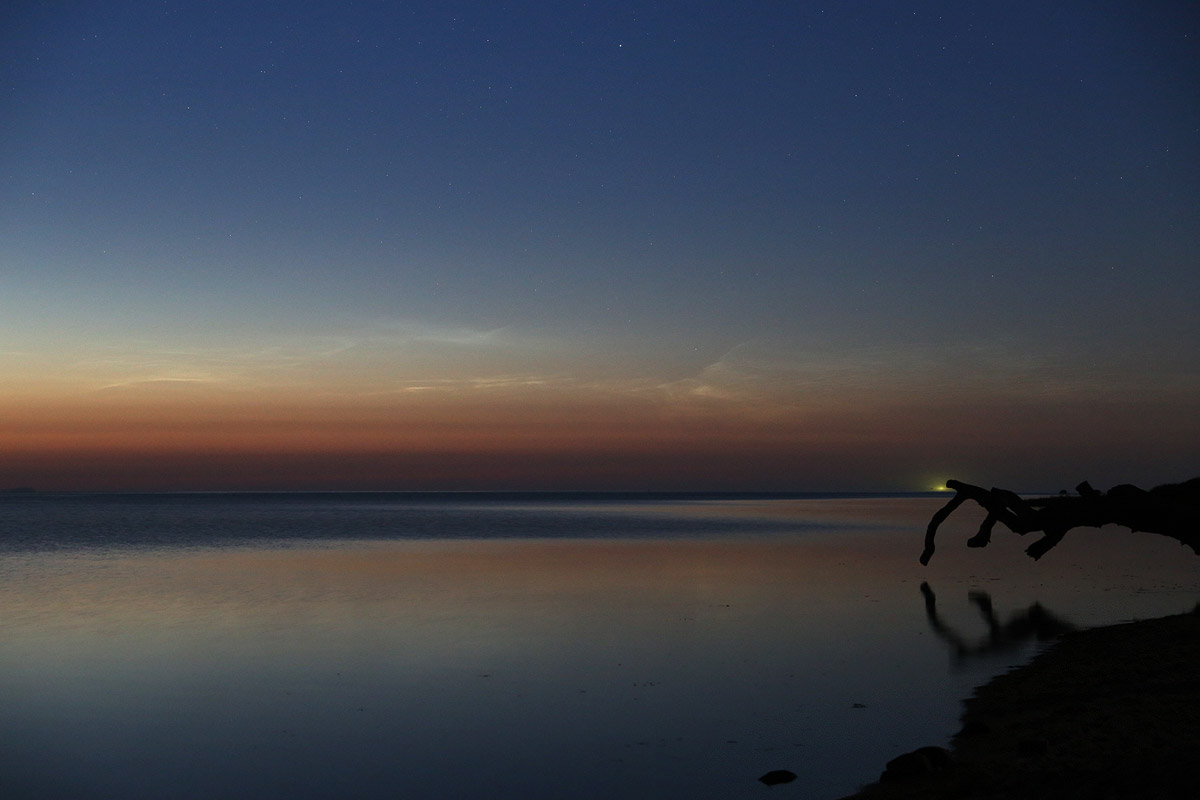 Das es zu dem Zeitpunkt bereits fotografische Nachweise von NLC gab, wusste ich nicht. Erst als die Kamera ihre Aufnahmen machte, guckte ich ins Forum und beeilte mich dann, zum Fähranleger zu wechseln, wo ich klare Sicht nach Norden habe. Die NLC waren zu diesem Zeitpunkt visuell nicht wahrnehmbar, aber fotografisch gelang mir der Nachweis, sie standen direkt über dem Waldrand neben dem Strand.