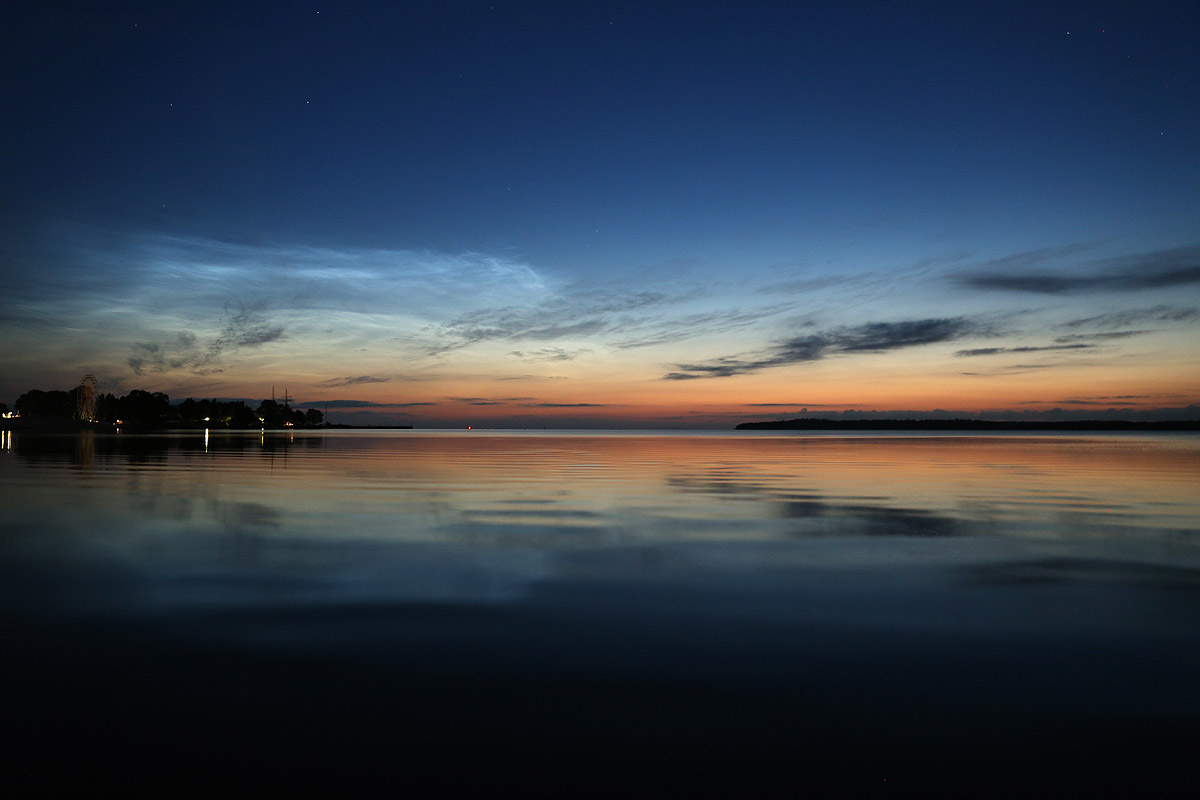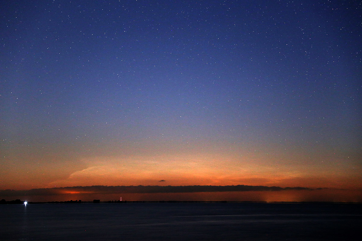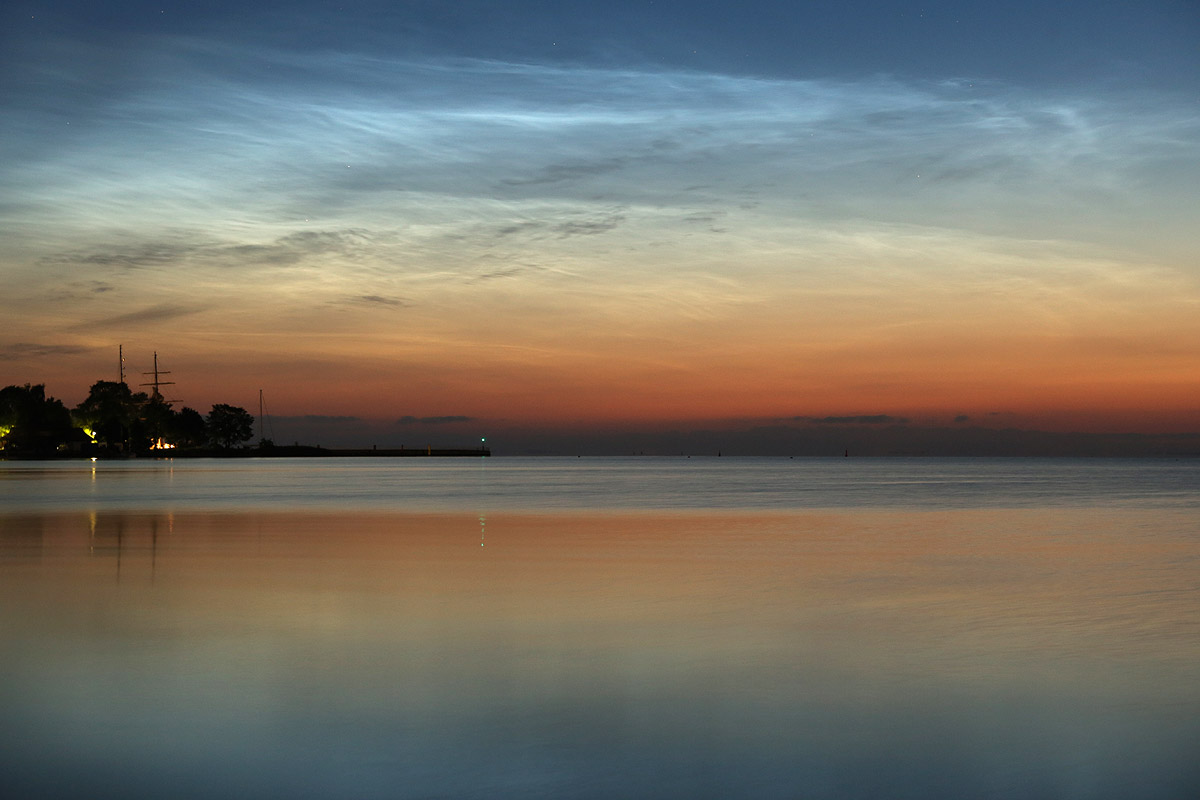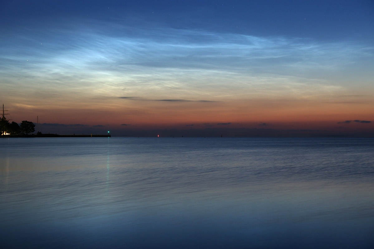 Die NLC waren mit bloßem Auge zu diesem Zeitpunkt noch nicht zu erkennen. Meine Position befand sich am unteren südöstlichen Ende des Strandbads in Greifswald Wiek, mit Blick nach Norden zur Hafenausfahrt Wieck und zur Nordmole mit dem typischen grünen Signal.