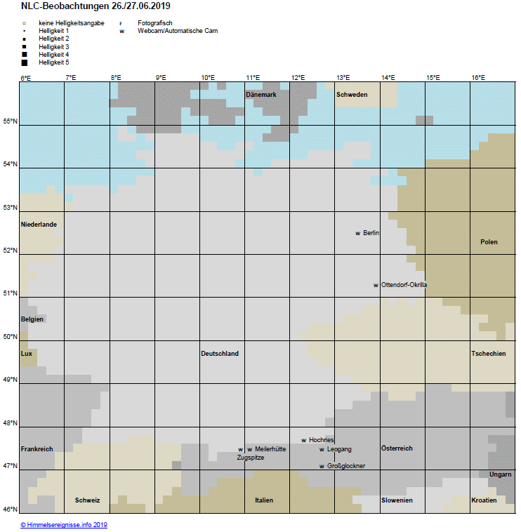 die NLCs in der Nacht 26./27.06.2019 wurden ausschließlich an Webcams im Osten Deutschlands und in den Alpen nachgewiesen (Abb. 1).