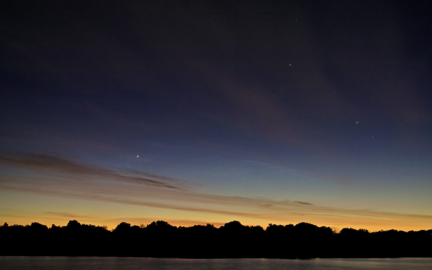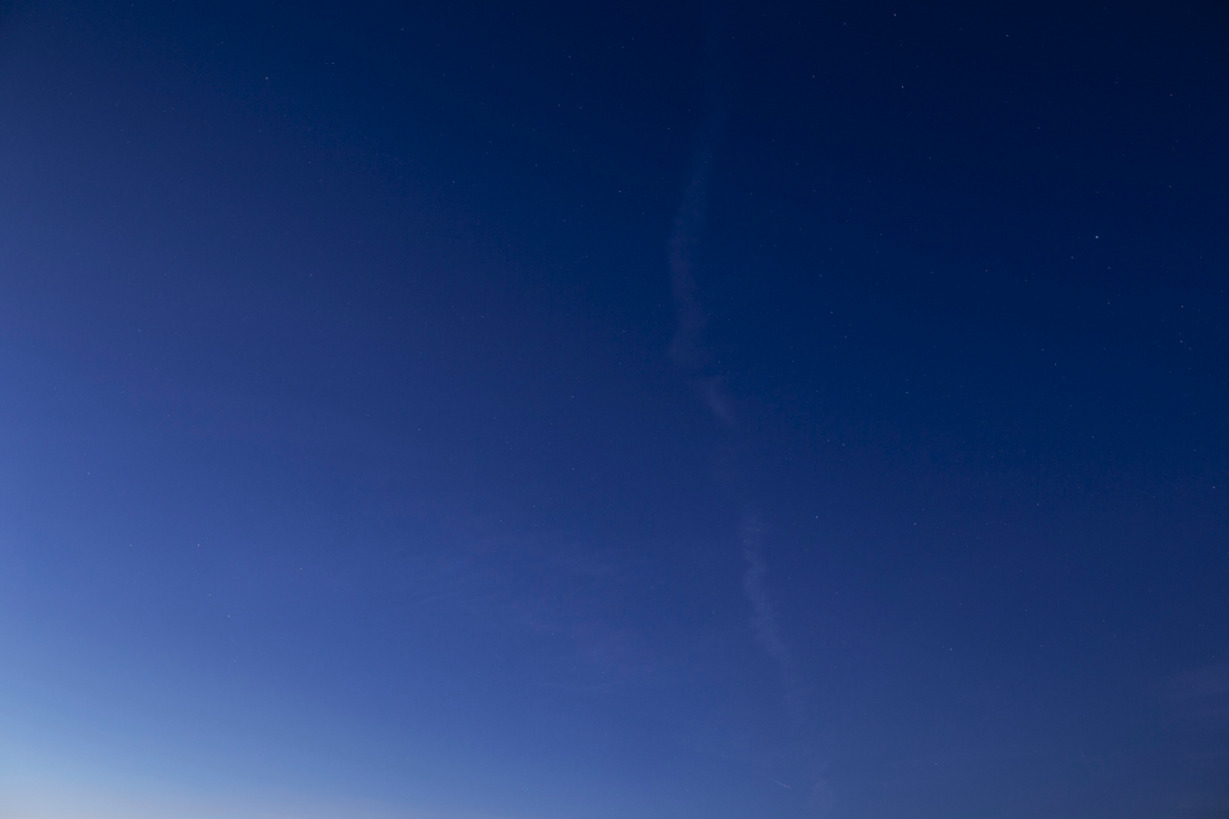 Visuell waren während der ganzen Nacht keinerlei NLC zu bemerken. Selbst genaues Betrachten des Himmelsareals, wo Fotos NLC zeigen, ließ zwischen den Zirren mit bloßen Augen keinen Verdacht aufkommen, dass dort Leuchtende Nachtwolken sein könnten. Schlussendlich nutzte ich die dafür geeigneten Minuten der frühen Morgendämmerung, um mit der uralten und heißgeliebten Farbkamera die Grenze ihrer Möglichkeiten zu reiten, und ein bisschen Kapella im Morgengewölk abzulichten. Und: Man weiss ja nie!
