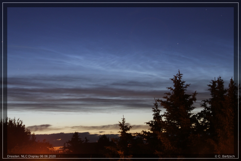 In Wolmirsleben konnte ich heute ebenfalls NLC's beobachten, genauer gesagt ein nörldliches und ein westliches Display. Die Beobachtungszeit war von 22:30-23:30 Uhr. Die Höhe des nördlichen Displays war etwa 5° und des westlichen etwa 8°.