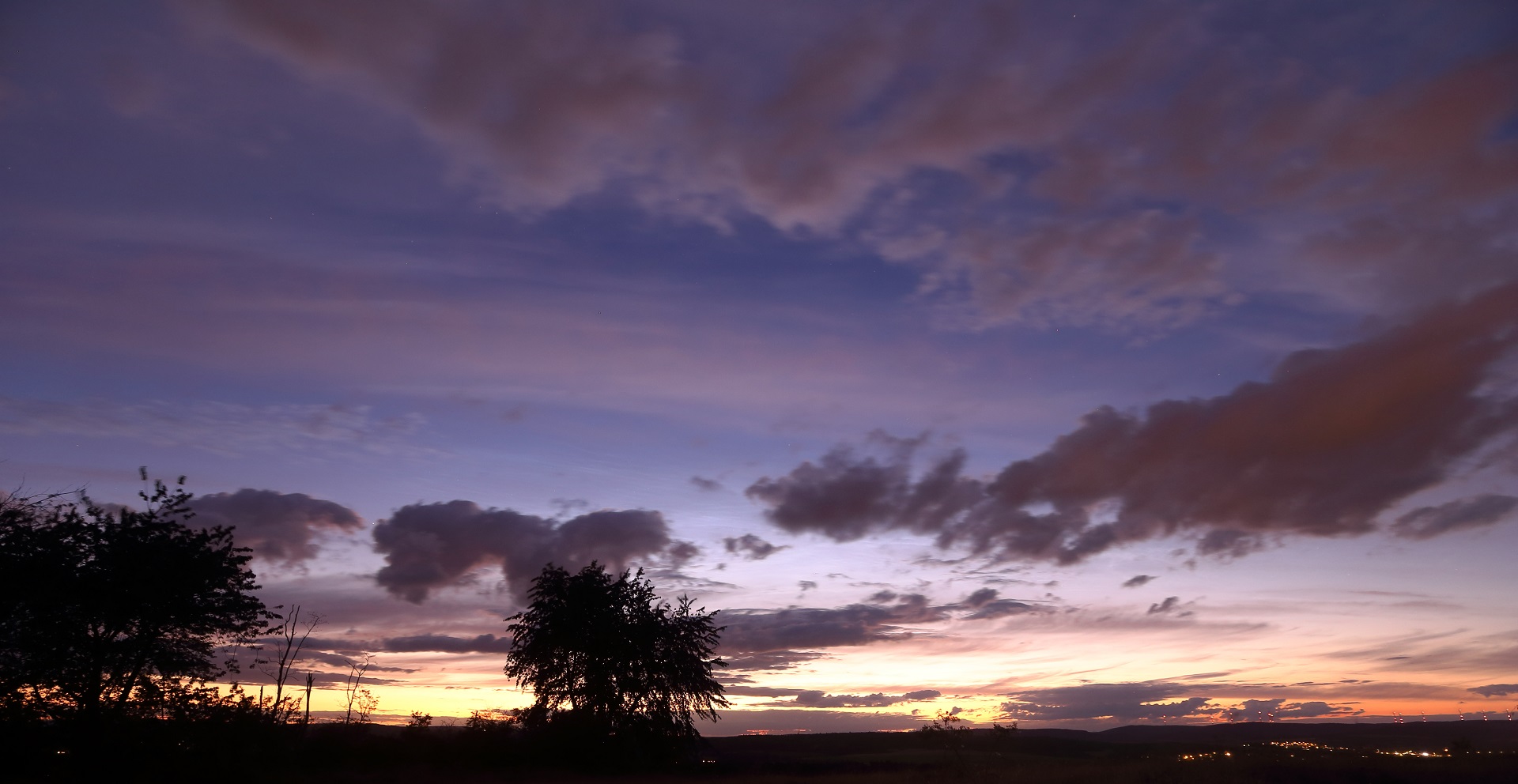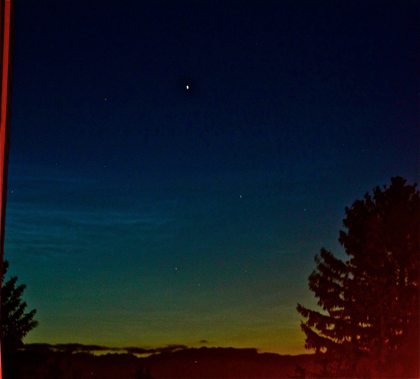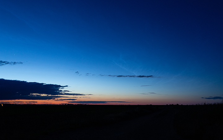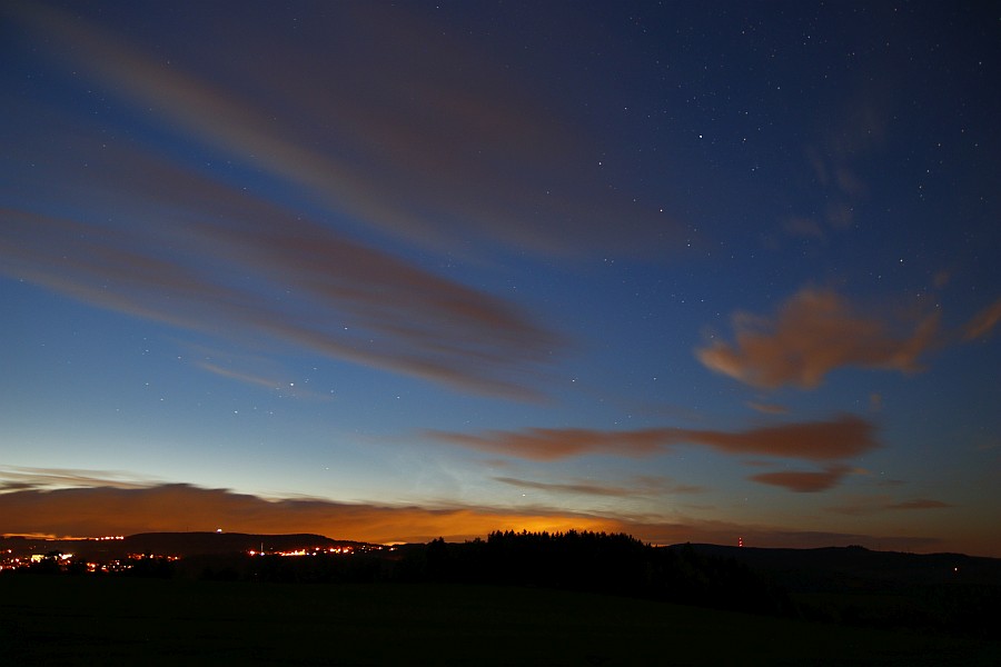 Leider habe ich sie nicht von Anfang an mitbekommen, was wohl an der Bewölkung lag. Gegen 22:45 fiel mir im NNO etwas auf, was NLCs gewesen sein könnten. Kurz darauf erschienen die NLCs bis in ca. 20° Höhe, deutlich sichtbar besonders gegen kurz nach 23:00. Leider kam alsbald eine Wolkenwand aus Westen, die sich davorschob. Ich blieb noch etwas, da vielleicht bei sinkendem Sonnenstand horizontnähere NLCs auftauchen würden, und ich konnte auch etwas ausmachen. Jedoch sehr kontrastarm und die Wolkenlücken wurden kleiner. Also bin ich abgeschoben.