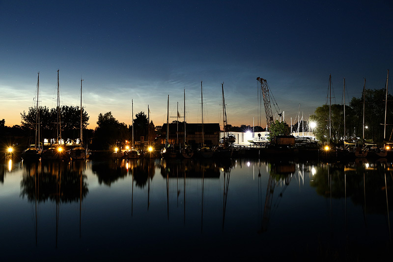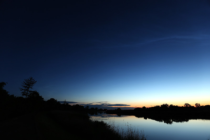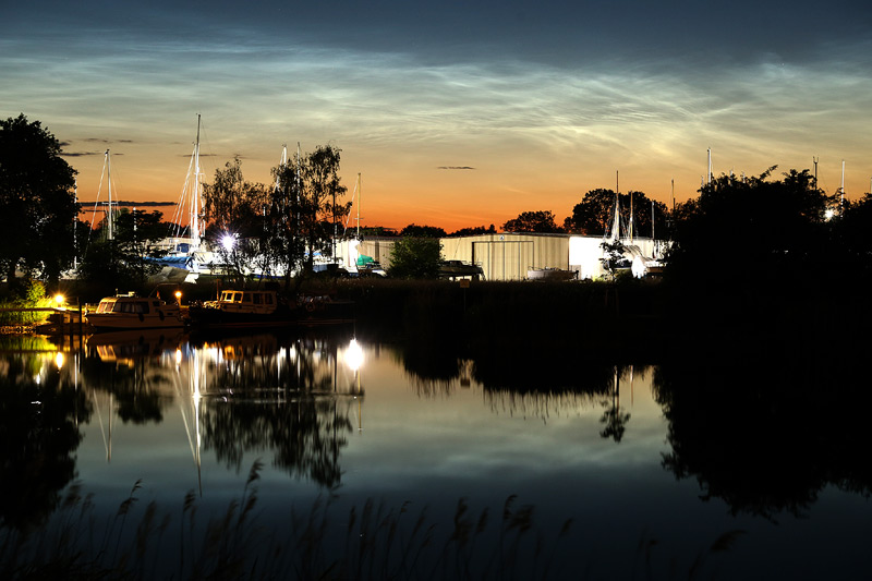Große NLC Felder am Abend habe ich nun schon ein paar gesehen und sie haben so ihre eigenen Gesetze. Anfangs kann man sie leicht mit hohen Kondensstreifen und vergleichbaren Strukturen verwechseln, daraus entwickeln sich dann aber leuchtende Nachtwolken. Heute habe ich schon auf dem Hinweg zum Ryck so einen verdächtigen Kondensstreifen etwas westlich von mir hoch oben von Nord nach Süd laufen sehen. Am Ryck angekommen, sah man dann auch den Rest des Feldes, das insgesamt nur wenig Kontrast aufwies und abgesehen von den großen Ausmaßen nicht spektakulär aussah. Aber so sind solche großen Felder eben, da sie nur sichtbar sind, wenn die Sonne noch nicht weit unter dem Horizont verschwunden ist, haben sie auch wenig Kontrast zum Himmel.