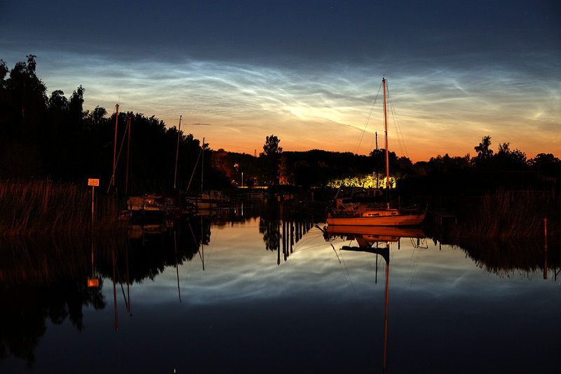 Die Leuchtenden Nachtwolken in der 1. Nachthälfte fielen hier im Spreewald leider den Wolken zum Opfer. In der 2. war dann ein hübsches horizontnahes Feld Richtung NNW bis NNO zwischen größeren Wolkenlücken erkennbar (Höhe ca. 7°, Helligkeit 3), das leider nicht an das NLC-Display der 1. Nachthälfte heranreichen konnte. Weiter Richtung NO zeigten sich schwächere NLC in etwas größerer Höhe (~25°, Helligkeit 1-2).