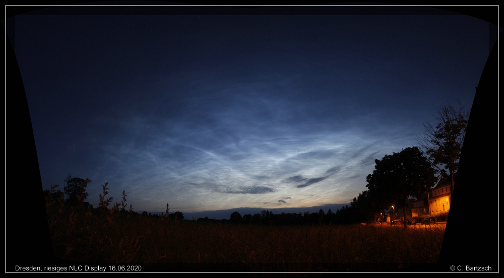 einfach nur verrückt. Bereits 22:00 Uhr sah ich sehr verdächtige NLC Strukturen in der hellen Dämmerung, so dass ich sofort zur Wohnung geradelt bin, um meine Kamera zu holen. Das Verdachtsfoto um 22:00 Uhr hatte ich noch schnell mit meinem Handy aufgenommen. Auf dem Platz angekommen, staunte ich nicht schlecht. Das NLC Display erreichte hier in Dresden zwischen 22:16 Uhr und 22:20 Uhr die maximale südliche Ausdehnung, die bis in den Zenit sichtbar war (Horizontale Ausdehnung von 240°W bis min. 40°O). Bereits nach 20-30 min. schrumpfte das Display auf etwa der halben Höhe. Für mich war es Helligkeitsskala 4. Ich musste in der Zeit mit meiner Canon EOS 1300D + 10mm Weitwinkelobjektiv Panoramabilder in Hochkantstellung á 5 Bilder aufnehmen, um überhaupt die gesamt Größe zu erfassen. Hier reichten schon 2 Sek. Belichtungszeit bei ISO 400 aus.