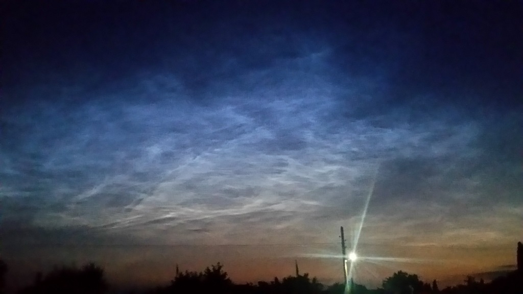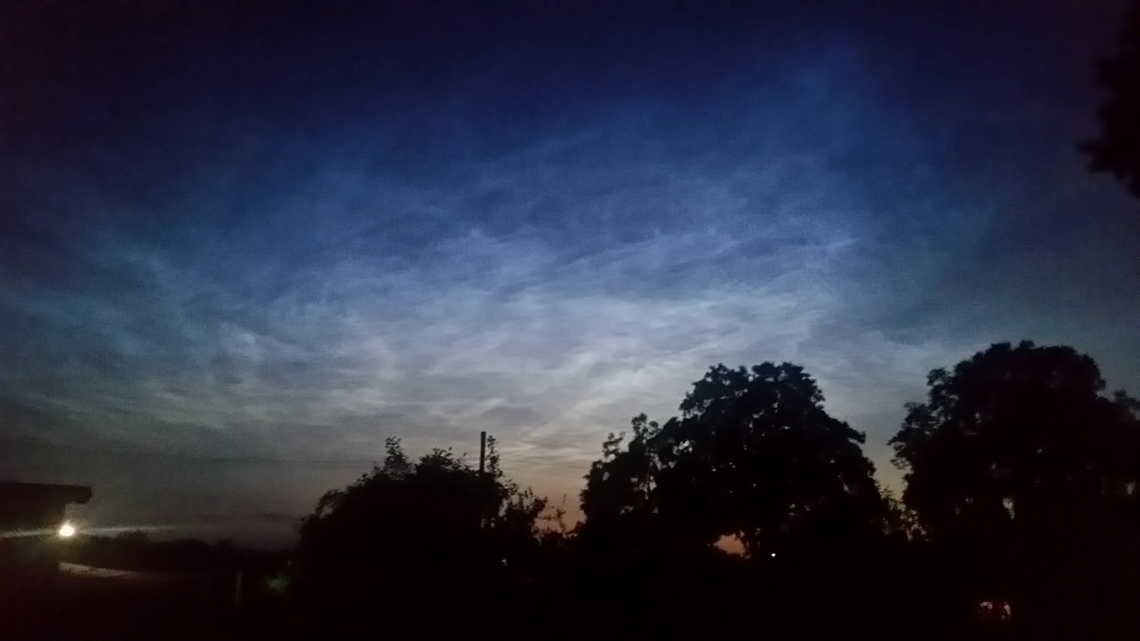 Der späte Blick in die Mails hat sich gelohnt, im Landkreis Harburg konnte ich in Richtung NW zumindest kurz noch welche sehen. Fotografiert aus einem Dachfenster, ohne Stativ, daher ISO 6400... musste eben schnell gehen. Beeindruckend, ich hatte vorher noch nie bewusst NLCs wahrgenommen!