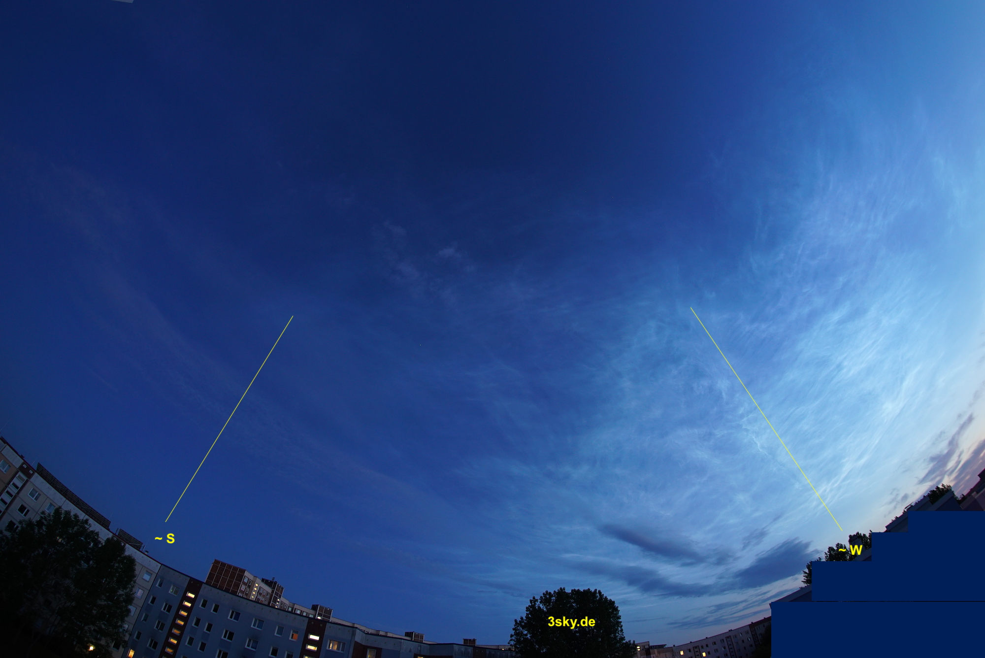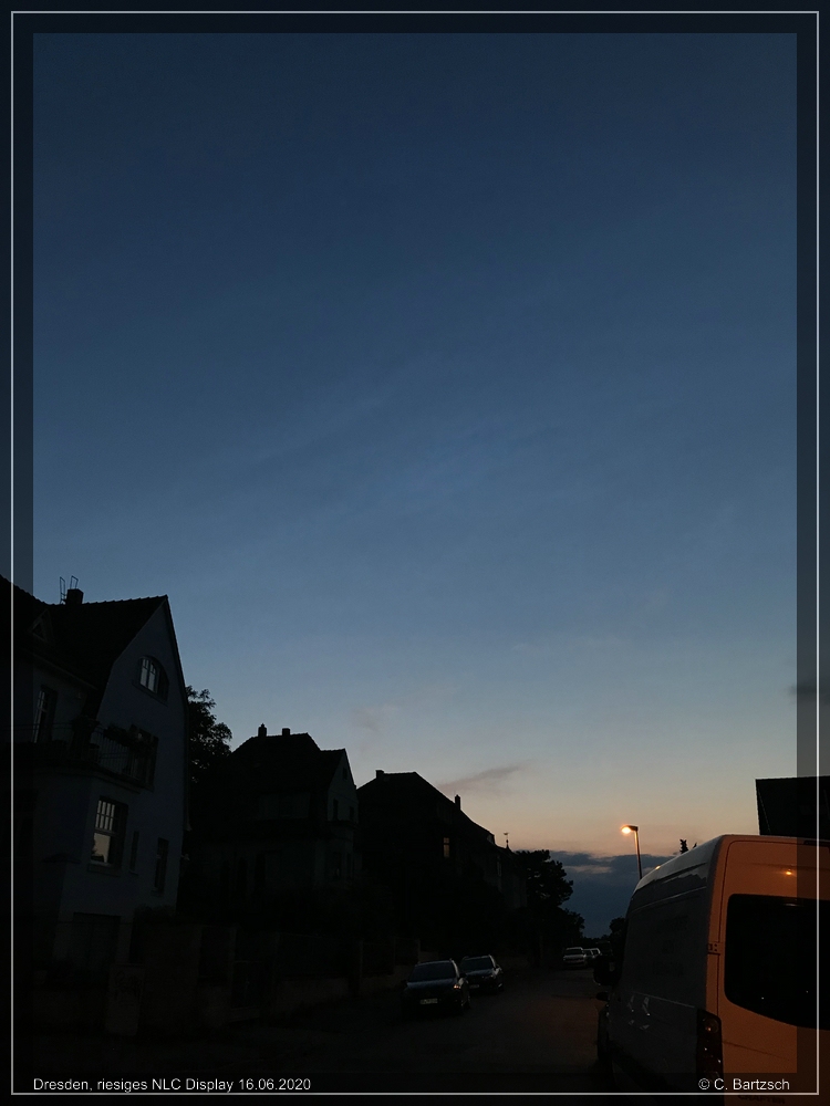 einfach nur verrückt. Bereits 22:00 Uhr sah ich sehr verdächtige NLC Strukturen in der hellen Dämmerung, so dass ich sofort zur Wohnung geradelt bin, um meine Kamera zu holen. Das Verdachtsfoto um 22:00 Uhr hatte ich noch schnell mit meinem Handy aufgenommen. Auf dem Platz angekommen, staunte ich nicht schlecht. Das NLC Display erreichte hier in Dresden zwischen 22:16 Uhr und 22:20 Uhr die maximale südliche Ausdehnung, die bis in den Zenit sichtbar war (Horizontale Ausdehnung von 240°W bis min. 40°O). Bereits nach 20-30 min. schrumpfte das Display auf etwa der halben Höhe. Für mich war es Helligkeitsskala 4. Ich musste in der Zeit mit meiner Canon EOS 1300D + 10mm Weitwinkelobjektiv Panoramabilder in Hochkantstellung á 5 Bilder aufnehmen, um überhaupt die gesamt Größe zu erfassen. Hier reichten schon 2 Sek. Belichtungszeit bei ISO 400 aus.
