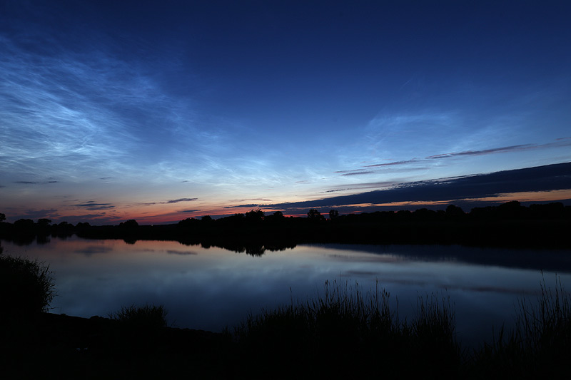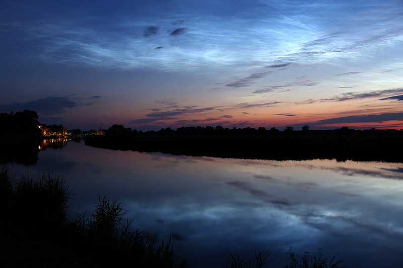 Danach begab ich mich an den Ryck und suchte eine Position auf, die mir einen halbwegs brauchbaren Blick in westliche Richtung versprach. Normalerweise sind die NLC ja auf die andere Seite vom Ryck beschränkt, also auf das nördliche Ufer. Heute aber war das anders, die NLC reichten bis weit in den Westen.
