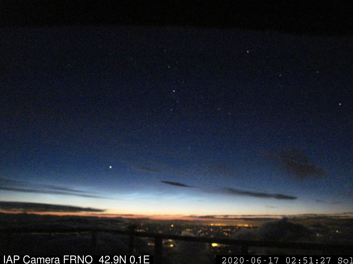 Im Morgensektor hat es ein kleiner Teil der NLCs noch auf die IAP-Cam "FRNO" auf dem Pic du Midi de Bigorre in den französischen Pyrenäen geschafft. Ich hab sie dort auf 3 Frames: 02:43:16, 02:51:27, 03:03:33 UT sehen können. Insgeheim hatte ich ein wenig mit Calar Alto geliebäugelt. Ein solch weites Vorankommen kann ich für diese Nacht allerdings definitiv ausschließen. Am Morgen sind die NLCs beispielsweise auch noch ganz gut auf den Zugspitzen-Fotowebcams in Erscheinung getreten, am Abend ließe sich zumindest ein Verdacht auf der Pizol-, oder der Bürgenstock-Cam ausmachen. Strukturell ist da zwischen dem ganzen troposphärischen Gewölk aber wenig bis gar nichts zu sehen. Zum Abendsektor kann ich bzgl. des Vorankommens ansonsten noch nicht viel sagen. Da hatte ich nur mal schnell einen Kontrollblick drauf geworfen und bin in Frankreich zwischen Wolkenlücken noch bis zum 46ten Grad nördlicher Breite fündig geworden (Paray-le-Monial, skaping.com), allerdings der Höhe nach mit Potential für mehr. Leider war der Bedeckungsgrad in den in Frage kommenden Gebieten, vorzugsweise im Alpenraum, fast flächendeckend sehr hoch.