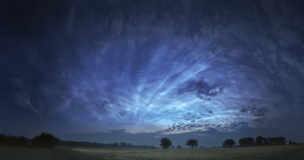 Um 22:14 Uhr (MESZ) dann die erste (überwältigende) Nachricht von Marcus aus Freiberg (Sachsen), dass die NLCs bei ihm den Zenit bedecken. Die Kamera habe ich nun hektisch aus Norden in die entgegengesetzte Richtung gedreht und konnte bereits um 22:25 MESZ (Sonnenstand bei -4,9°) fotografische NLC-Stukturen bis weit in den Süd(-Westen) erfassen. Wenig später – als sich die NLCs bei mir im Zenit deutlich abzeichneten - die SMS von Dennis, dass es auch bei ihm zu einer fulminanten Entwicklung am brandenburgischen Himmelszelt kommt. Danke für diese Nachrichten! - die Stimmung war großartig, war ich doch den Wolken entkommen und durfte nun auch dieses gigantische NLC-Feld über mir beobachten. Hier eine Panorama-Aufnahme (22:57 MESZ, Sonnenstand bei -7,8°, Richtung NNW in der Bildmitte) aus 13 Hochformat-Aufnahmen (24mm, Kleinbild), welches einen Blickwinkel von ca. 180° in der Breite und den Himmel bis ca. 70° in der Höhe abbildet: