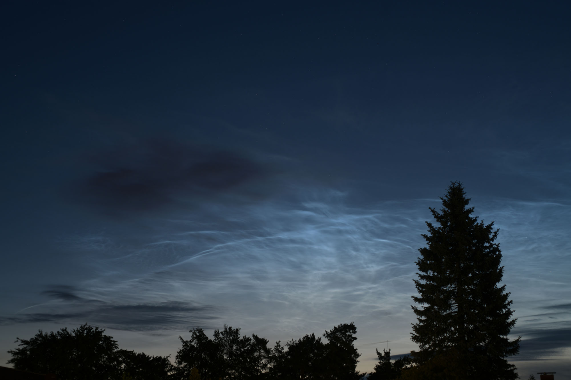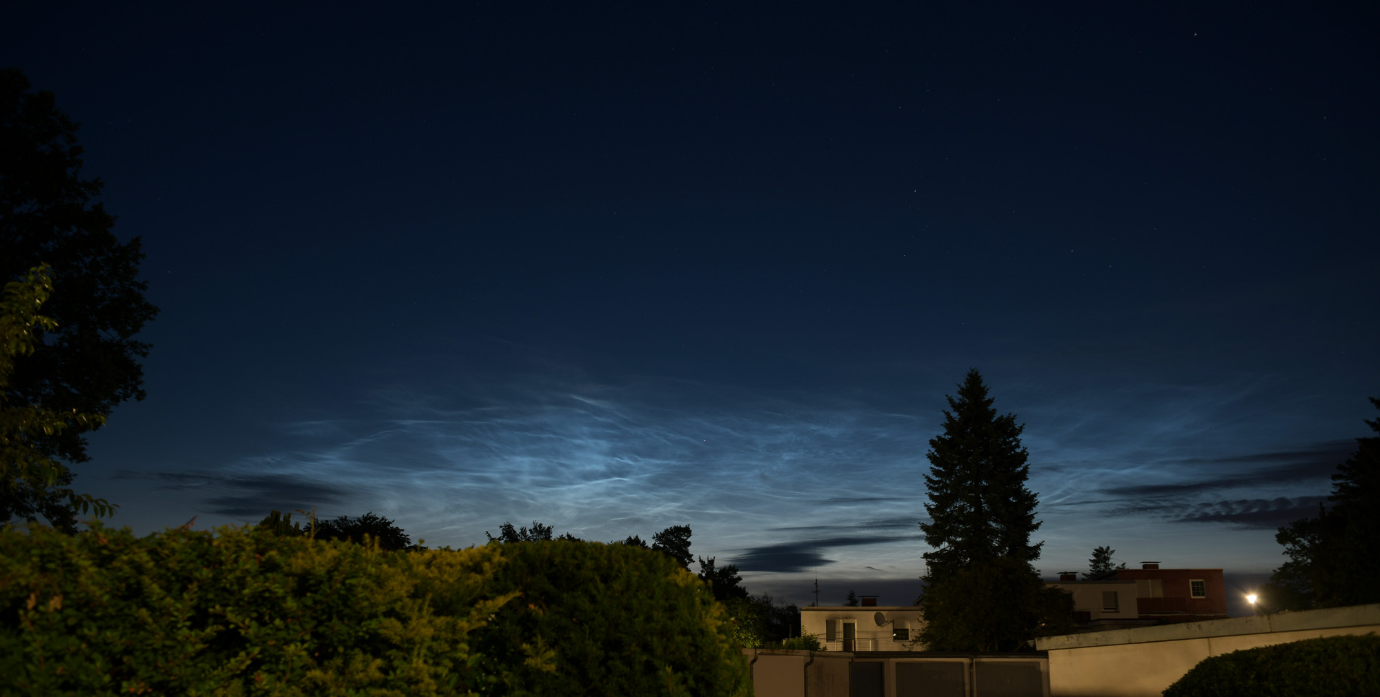 Ich hatte gestern Nacht beim sehr späten zu-Bett-gehen etwas helles am Horizont gesehen und bin dann schnellstens raus auf der Suche nach einem Standort mit Himmelsblick. Dort sah ich mein deutlichstes und hellstes NLC, welches ich in der Pfalz bis jetzt gesehen habe. (ich achte immer mal auf den Himmel, bin aber kein "NLC-Jäger"). Bin so begeistert, daß ich dachte ich zeige es hier auch mal.