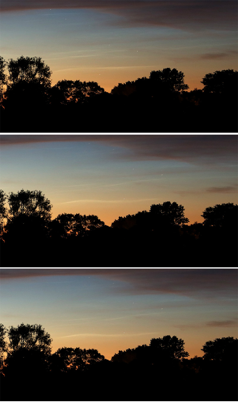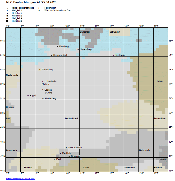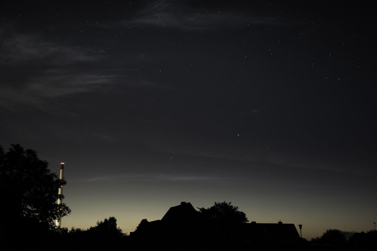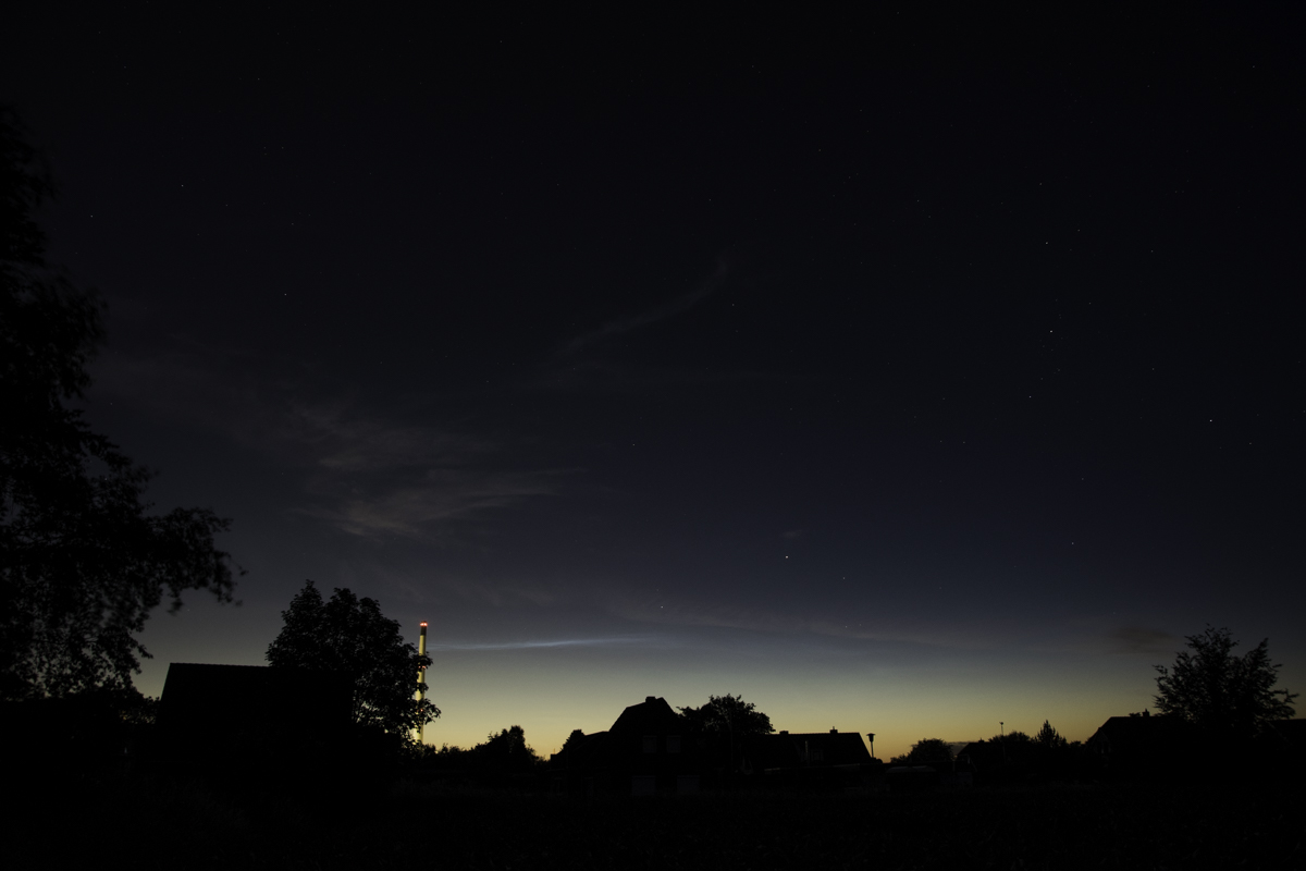 und genau das sind auch meiner Meinung nach leider keine NLC sondern nur troposphärische Zirruswolken. Die sind auch gut um die Zeit im Infrarotsatellitenbild nördlich von Usedom zu erkennen. Typischer Fall von "Fake-NLC". Die Zirren erscheinen durch die Dämmerung hell vor dem dunkleren Hintergrund.
