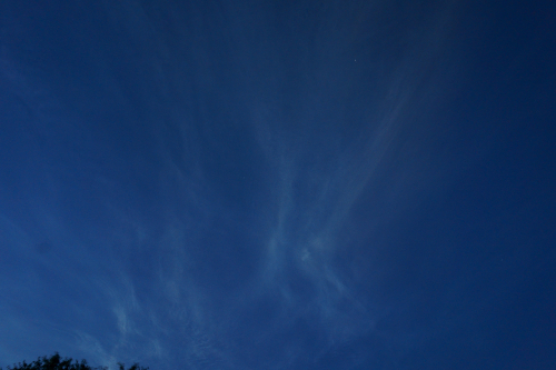 In Wardenburg war es noch ziemlich hell, als ich so 22:45 Uhr MESZ am Beobachtungsort ankam. Leider hing Richtung Norden bis auf etwa 20° ein dickes Wolkenband. Aber darüber waren schon deutlich NLC zu erkennen. Also Helligkeit mindestens 3, im Maximum 4, Höhe 30°-40°. Leider zogen von Westen genau in dieser Höhe schnell troposphärische Wolken herein. Zum Glück gab es Richtung Zenit noch Wolkenlücken. Und ich traute meinen Augen kaum, selbst in südlicher Richtung waren sie zu sehen. Sie gingen dort bis etwa 20° herunter...