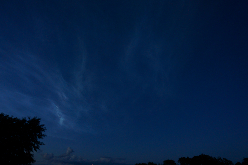 Eine halbe Stunde später waren die NLC Richtung Süden und im Zenit nicht mehr auszumachen. Richtung Norden waren sowieso nur noch kleine Wolkenlücken. Und fünf Minuten später fing es an zu regnen... Ich bin dann noch einige Kilometer Richtung Süden gefahren und konnte sogar noch einen Blick auf Capella erhaschen. Es war so 23:30 Uhr. Westlich davon schienen mir noch NLC mit der Helligkeit 2 zu sein, aber kurze Zeit später waren sie nicht mehr auszumachen, vielleicht hinter den Wolken...