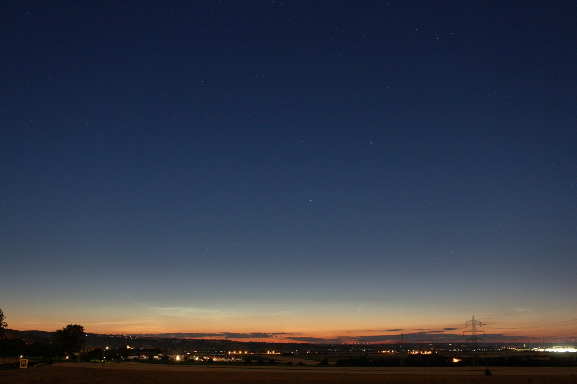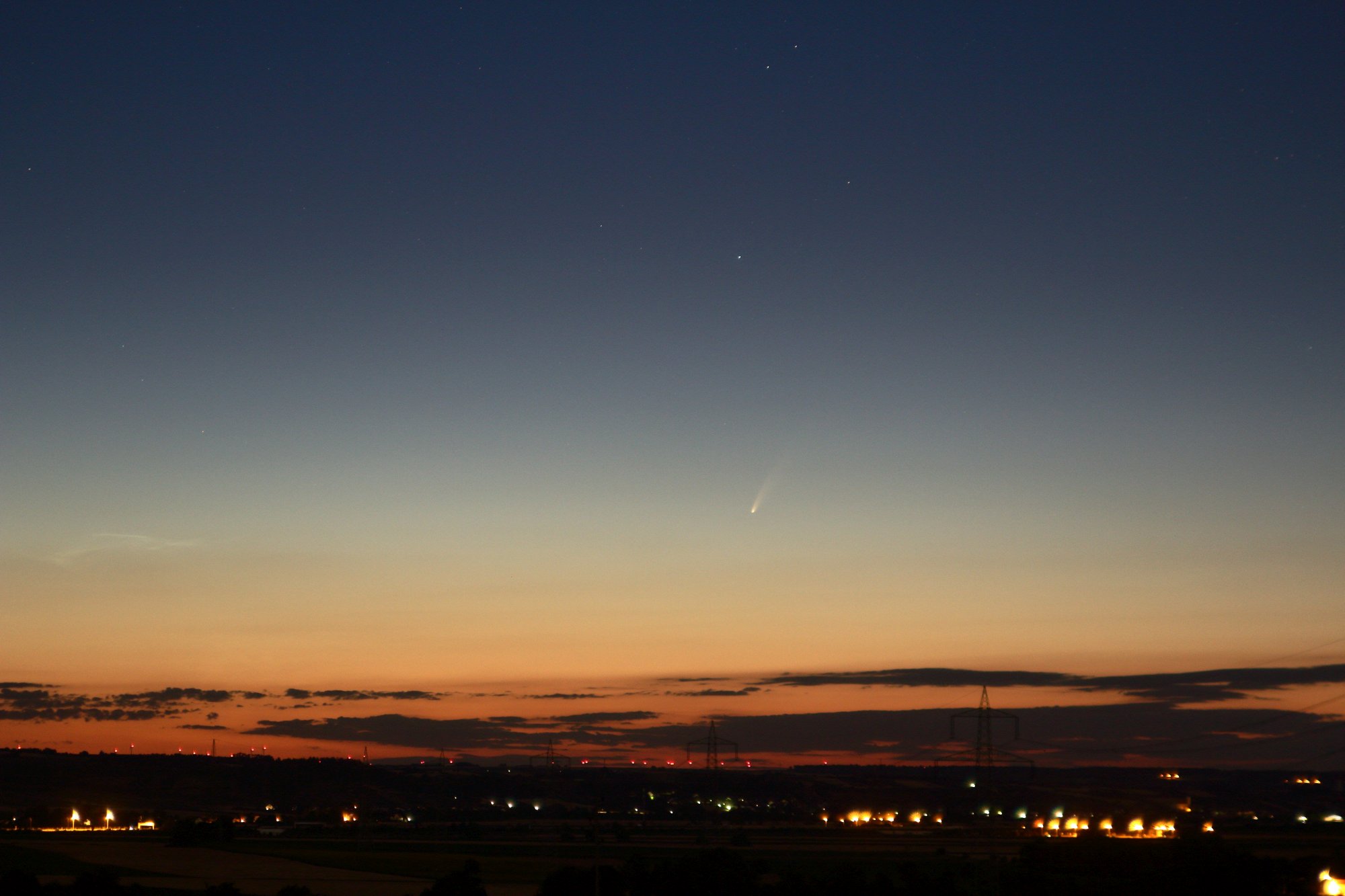So schöne NLCs wie am Abend des 5. gab es am Morgen des 6.Juli nicht. Dafür war anderes viel weiter entferntes Eis im Weltall mit freiem Auge sichtbar: Komet C/2020 F3 (NEOWISE). Beobachtungsort: Bisamberg bei Wien.