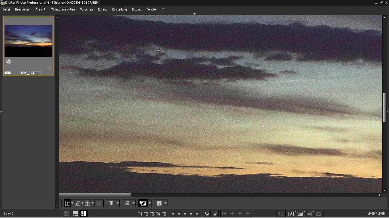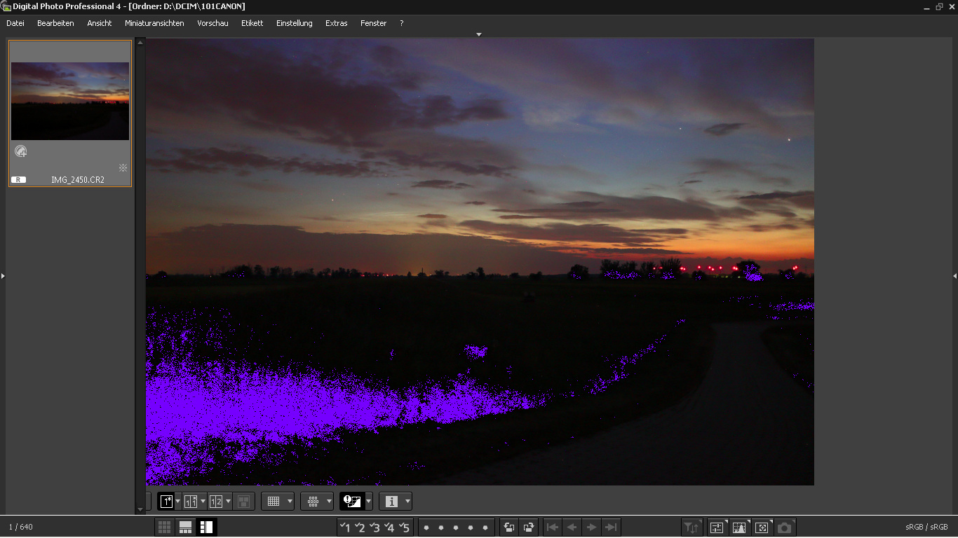 Nachtrag 1: Weil ich mit der Speicherplatzlimitierung hier nicht hinkomme und in geringer Auflösung so gut wie nichts zu erkennen ist von den schwachbrüstigen NLCs, gibt es heute mal Screenshots direkt aus der Entwicklungsumgebung Canon DPP. Die Aufnahme entstand 23:24 MESZ, Helligkeit wie gesagt 0/f (fotografisch). Höhe werde ich eventuell noch nachliefern.