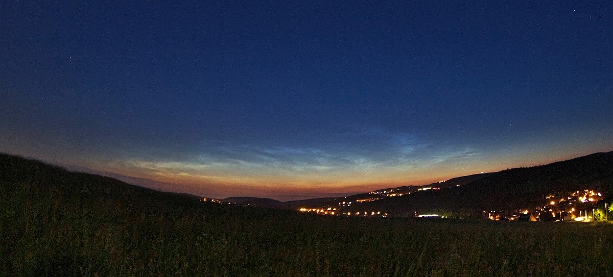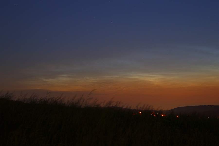 Auch am Nordrand von Wien am Rendezvousberg konnte ich die NLC mit freiem Auge sehen. Ab 20:30 UT waren sie wahrnehmbar (Sonne 11,3° tief), rund um 20:50 UT am hellsten (Sonne -13,0°), gegen 21:10 UT (-14,6°) verschwanden sie für das freie Auge.