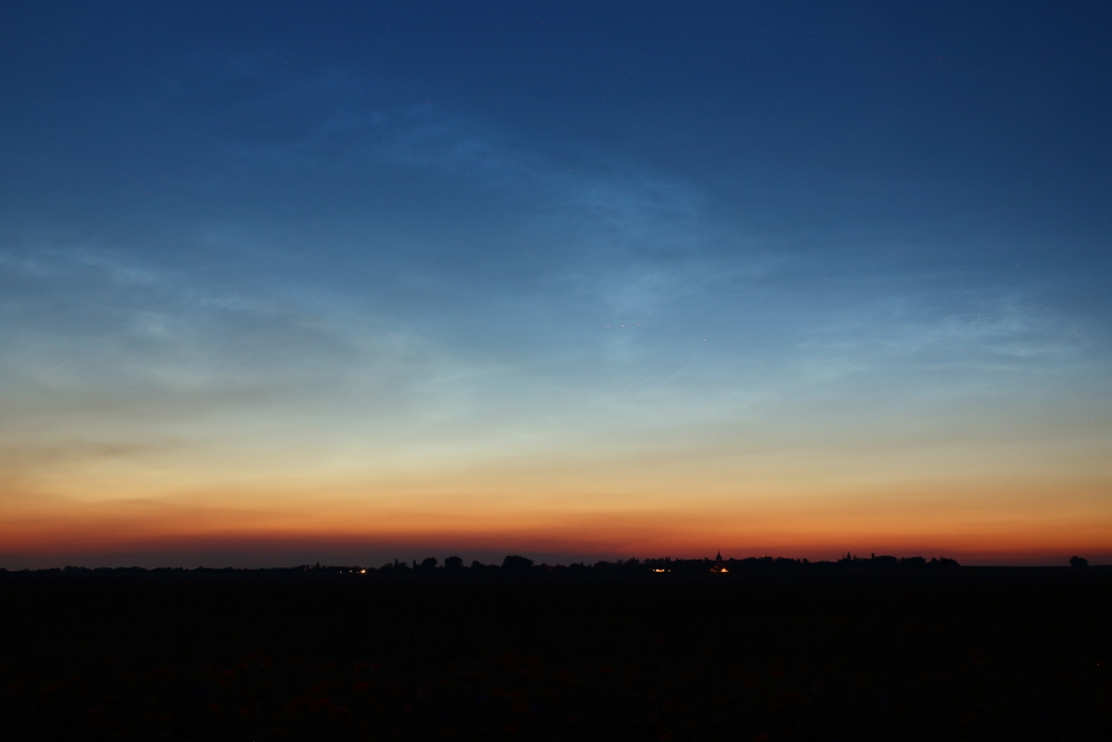 Hier mal noch mein Nachweis vom Abendsektor. Leider machte sich der Dunst über den Feldern und das troposphärische Gewölk bei der Bearbeitung des Materials im Vergleich zu dem, was ich auf dem Display der Kamera sah, dann doch deutlich stärker bemerkbar, als ich anfangs dachte. Bei der Bewertung der Helligkeit tue ich mich diesmal schwer. Denn einige Bereiche des Displays im westlichen Teil waren zeitweise so hell, dass ich geneigt wäre, hier auch eine 4 zu vergeben. Aber ob das nur meiner Hochsensibilität geschuldet ist, oder die NLCs tatsächlich die Aufmerksamkeit eines "Zufallsbeobachters" auf sich gezogen hätten, da bin ich mir letzten Endes nicht so sicher. Daher belasse ich es mal bei der 3.