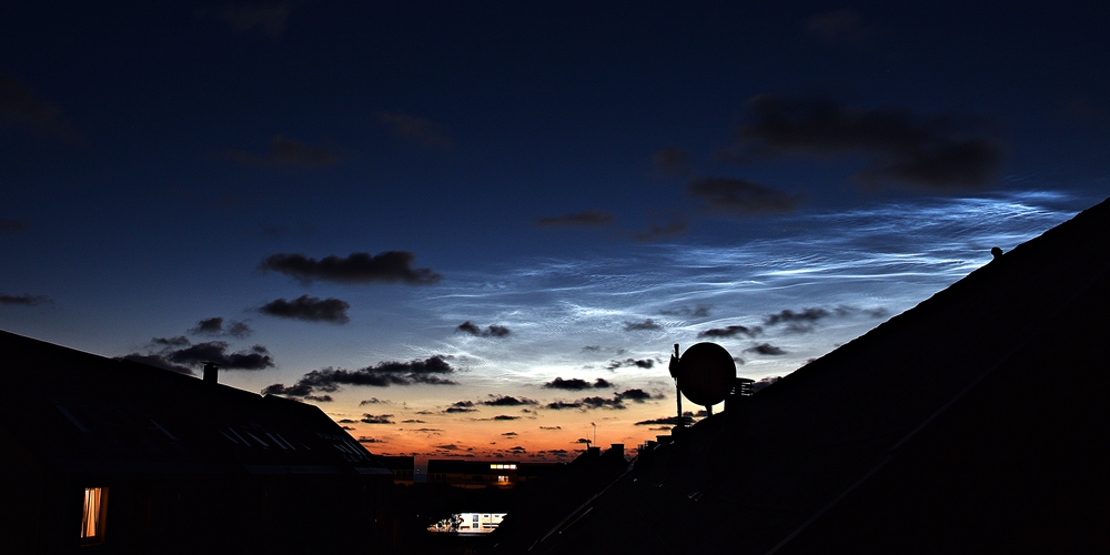 Weil Flensburg in diesem Juni Dauerbewölkung gebucht hat, haben wir uns (nach 1 Stunde Schlangestehen am einzigen nach 20 Uhr offenen Testzentrum) nach Dänemark aufgemacht. Schon auf halbem Wege nach Ribe wurden gegen 23 Uhr erste NLC deutlich am Dämmerungshimmel Richtung NW sichtbar. In Ribe angekommen, bot sich uns ein schönes 4er Display, das auf die 109° meines 10mm-Objektivs (APS-C) nicht mehr drauf passte. Das meiste spielte sich im NW ab, weiter östlich wuchs das Display aber stetig. Endlich unsere ersten NLC der Saison, und was für welche!
