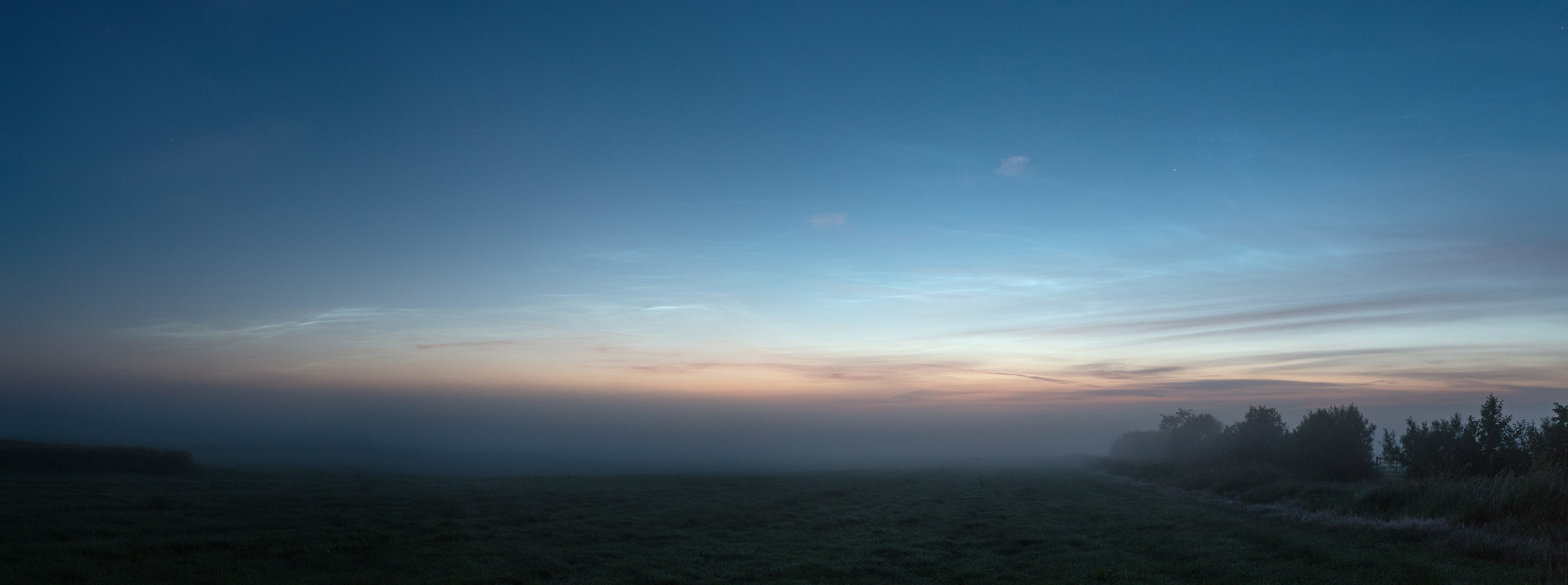 Am Ende landete ich in der Nähe von Bargstedt. Die NLC waren immer noch vorhanden, aber bei weitem nicht so hell wie am Abend. Sie erstreckten sich von NW bis NO. Und in diesem Panorama von 02:51 MESZ reichten sie bis etwa 15° hoch. Insgesamt eine tolle Stimmung mit flachen Nebelfeldern!