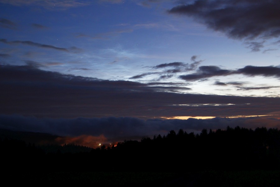 Auch von mir ein Bild von 22:55 MESZ, aufgenommen in Kirchhain: Für die Helligkeit würde ich eine 4 vergeben, die Höhe und die Ausdehnung ist relativ schwierig zu bestimmen, da es noch sehr hell war und nur wenige Sterne sichtbar waren. Zumindest ging das NLC-Feld mindestens bis zum großen Wagen, also circa 50°. Bei der Ausdehnung würde ich auf 280° bis 320° schätzen, da die NLCs besonders am NWN-Himmel waren.