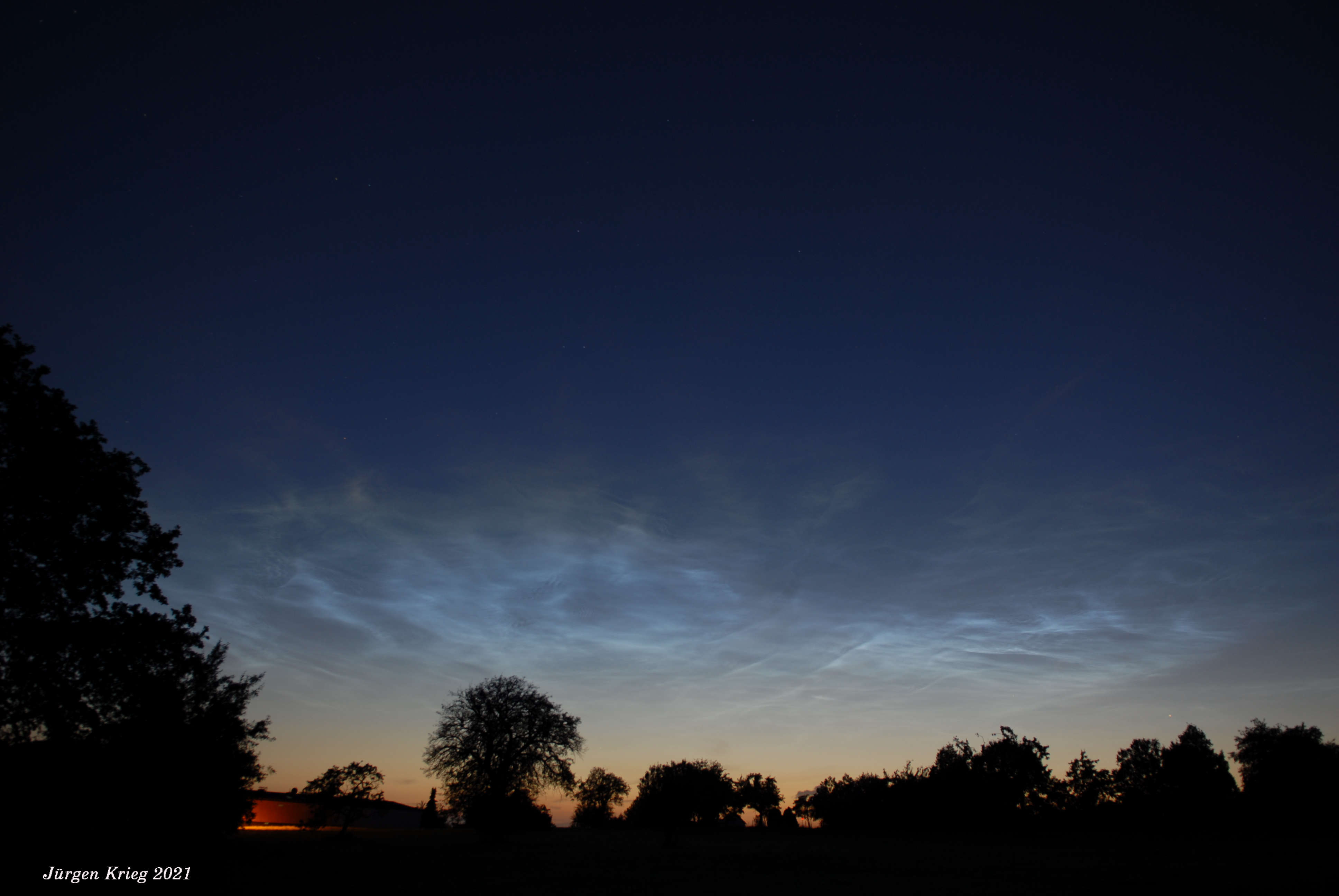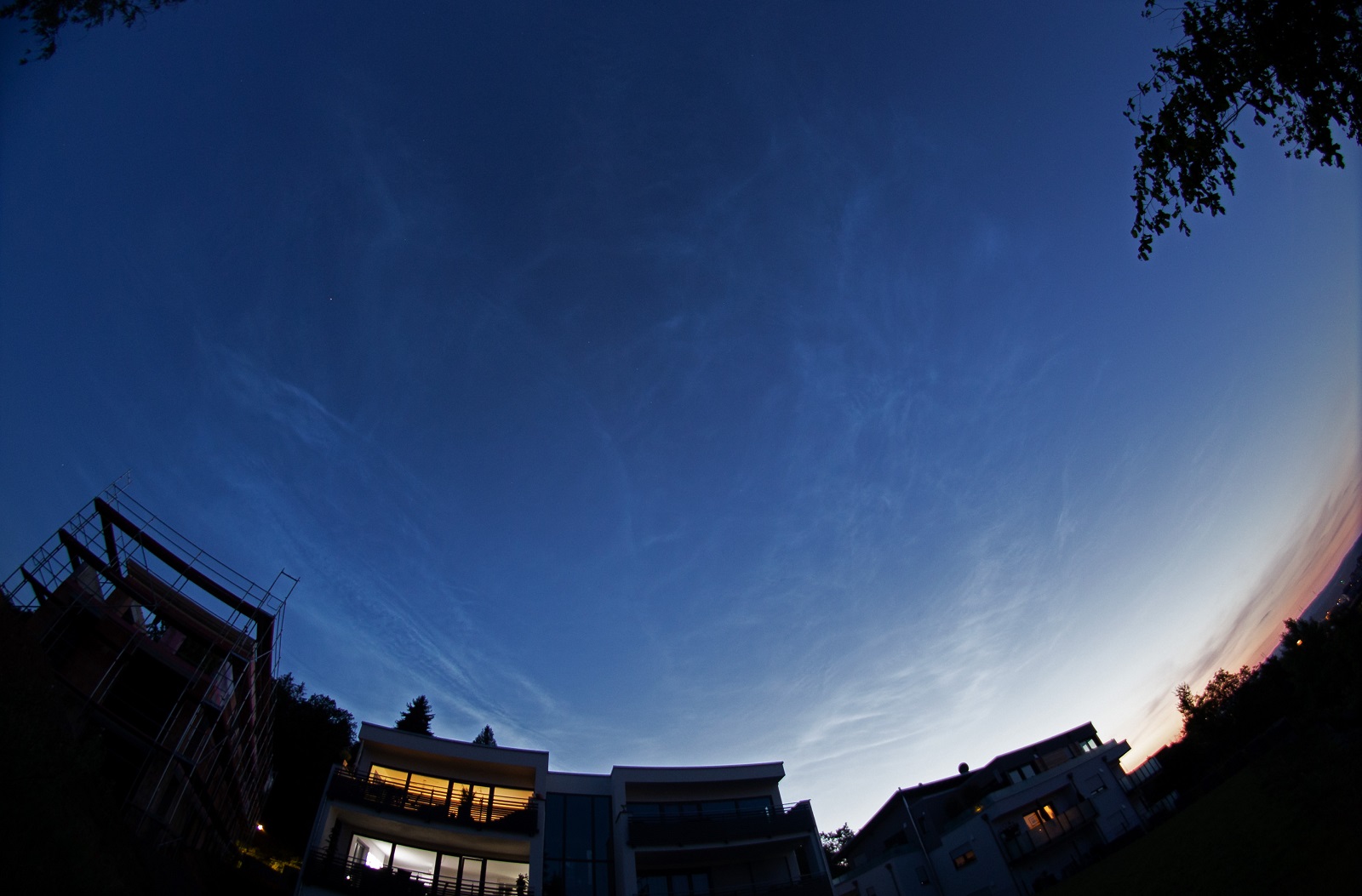 Wenig später, mit der zunehmenden Dunkelheit, wurde das gesamte Ausmaß der NLC sichtbar. Neben dem kleineren Feld im Südwesten und Westen gab es ein großes, das sich von Nordwest bis Nordost erstreckte und dessen schwächste Ausläufer um 23:12 MESZ bis 43° Höhe reichten: