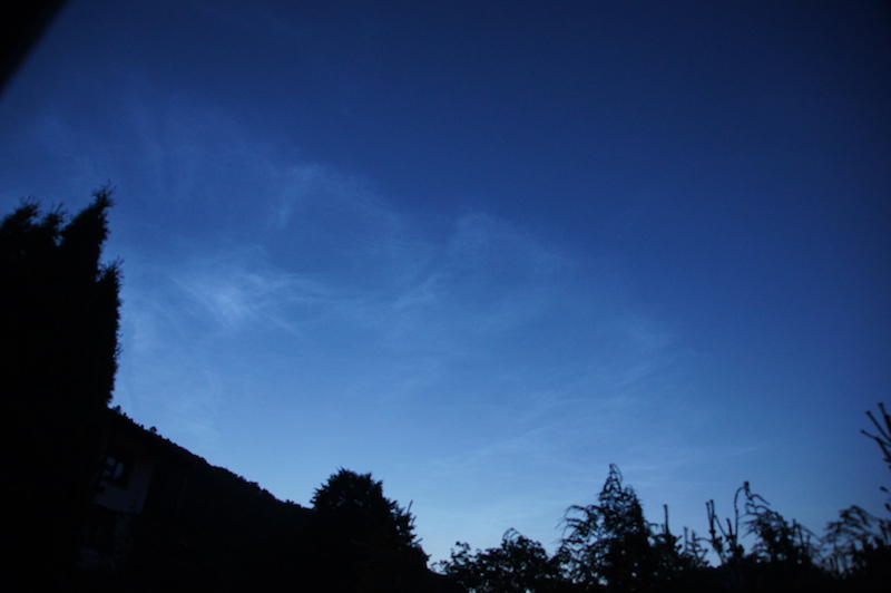 Als ich gegen 22:15 (MESZ) vom Sport zurückkam, fiel mir ein Wolkenfeld im Norden auf, das eigentlich zu hell für Cirren war, aber nach Cirren aussah und nicht nach NLC. Zumal weiter südlich noch eine Kondensstreifen-Cirre zu sehen war. Etwas später wurde klar, dass es tatsächlich NLCs sind. Es ist das erste Mal in diesem Jahr, dass ich sie hier von Heidelberg aus sehen konnte (meine dritte Erscheinung insgesamt).