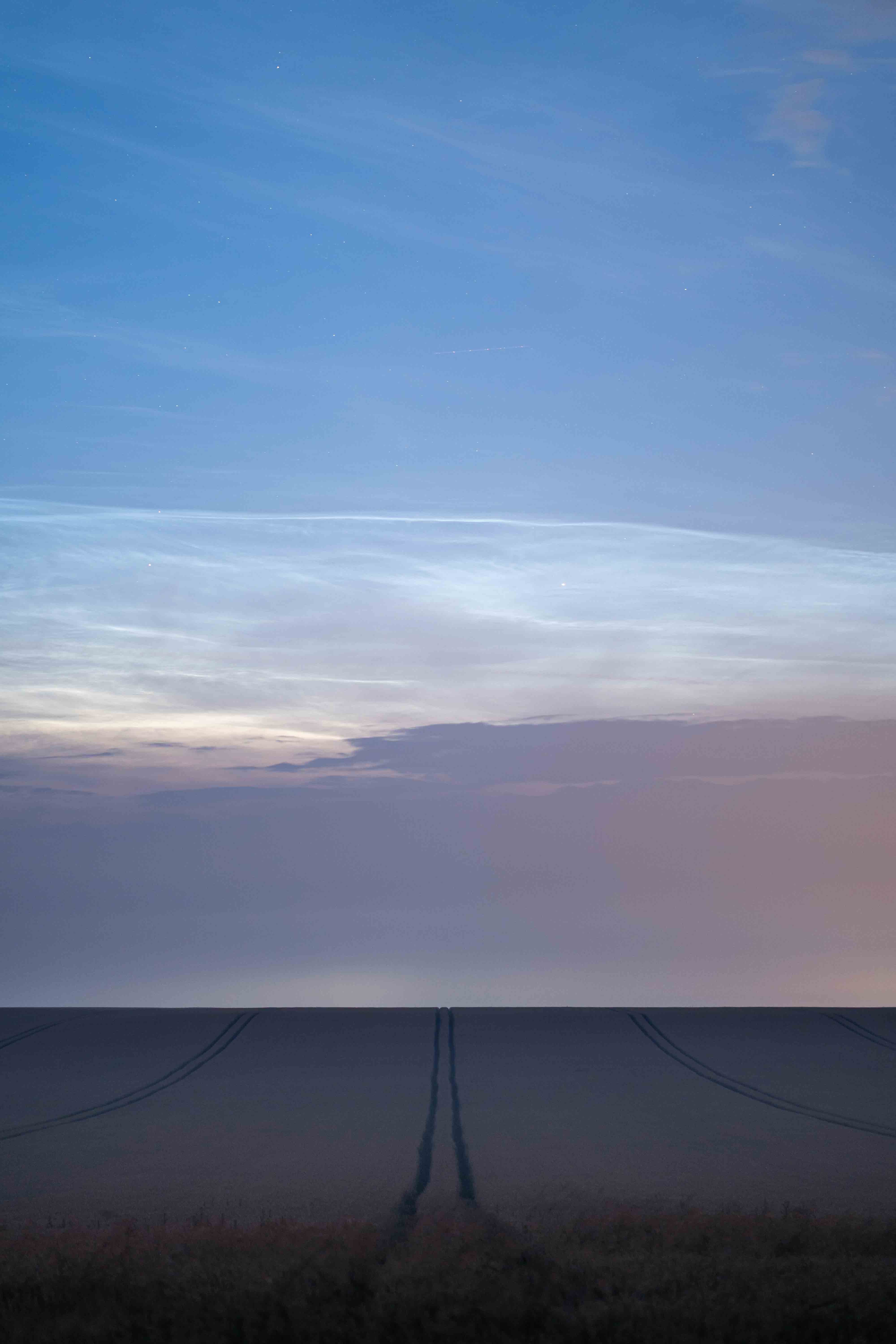 das war ja wirklich ein wunderschönes NLC-Ereignis gestern Abend. Wegen der von Nordwesten langsam aufziehenden Wolken fuhr ich rechtzeitig, so dachte ich zumindest, in die nähe von Talkau in SH (östlich von Hamburg). Doch schon bei meiner Ankunft um 22:45 MESZ waren NLC im Norden in der hellen Dämmerung zu erblicken. Und nicht nur dort sondern auch im Nordosten und sogar im Südwesten! Der Feldweg im Bild ist zufällig genau Richtung SW ausgerichtet: