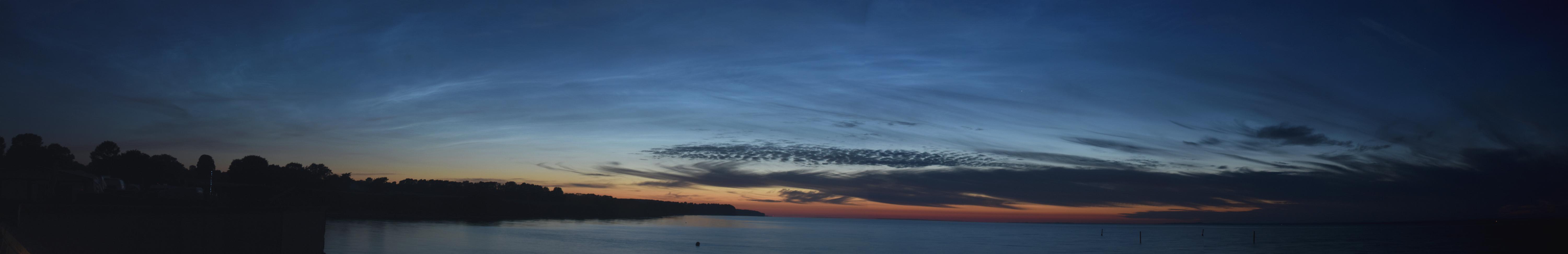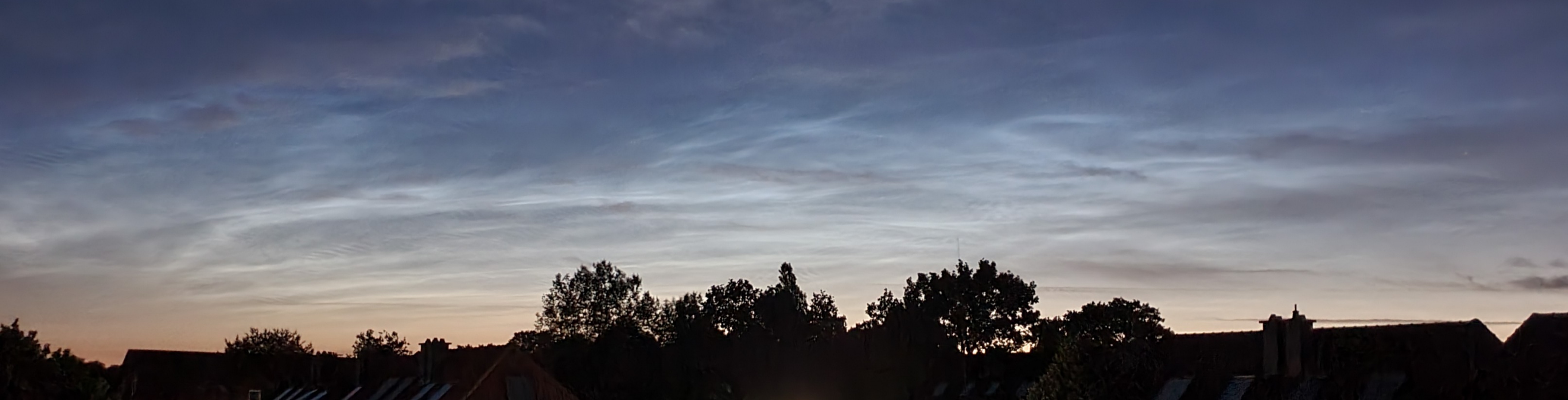 Schon bald nach Sonnenuntergang erschienen einige Wolken mit NLC-Anmutung am West- bis Nordhimmel. Doch Aufnahmen zeigten, dass sie die Bewegung der troposphärischen Wolken mitmachten und brav von West nach Ost zogen.