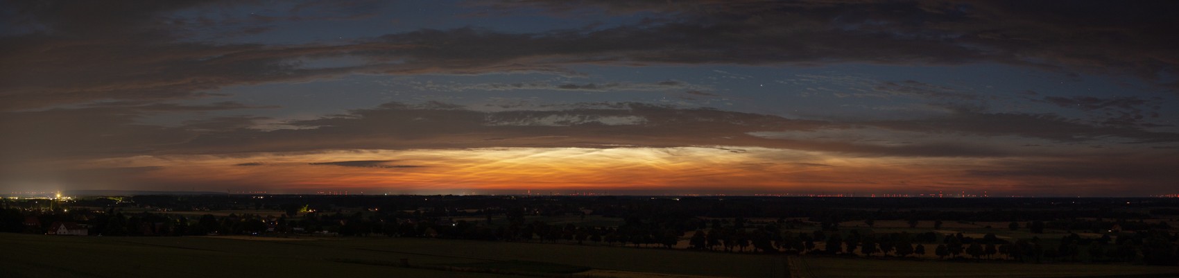 Da die Sicht laut Satellitenbild weiter nördlich deutlich besser sein sollte, fuhr ich wieder in die Nähe von Klein Parin bei Lübeck, von wo sich ein fantastischer Blick auf das nördlich gelegene Tiefland bietet. In diesem Fall mit Nebelfeldern und NLC der Helligkeit 4. In diesem Panorama von 02:20 MESZ reichten die NLC von 310 bis 45° und 10° hoch: