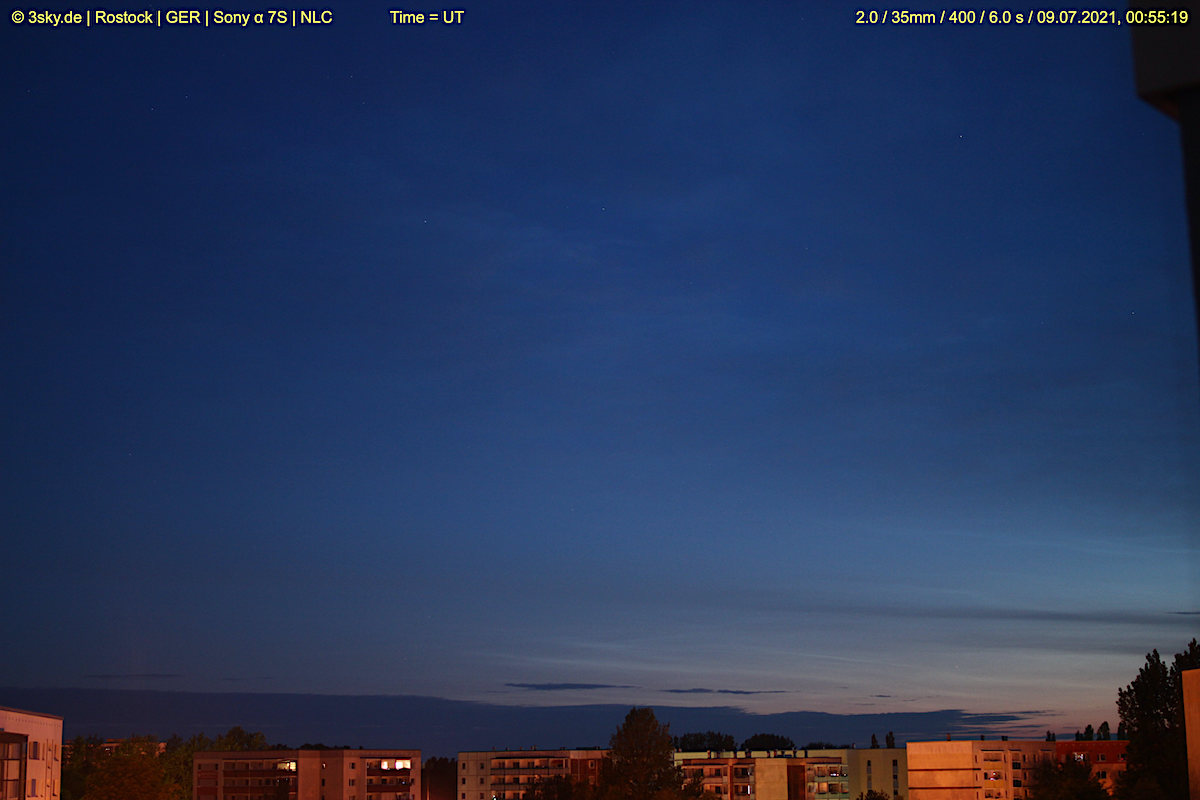 ab min. 23:10 UT NLC tief in ca. 348°, bald nach O hin erfaßbarer bis max. ca. 358 in / zwischen Wolken nachweisbar;