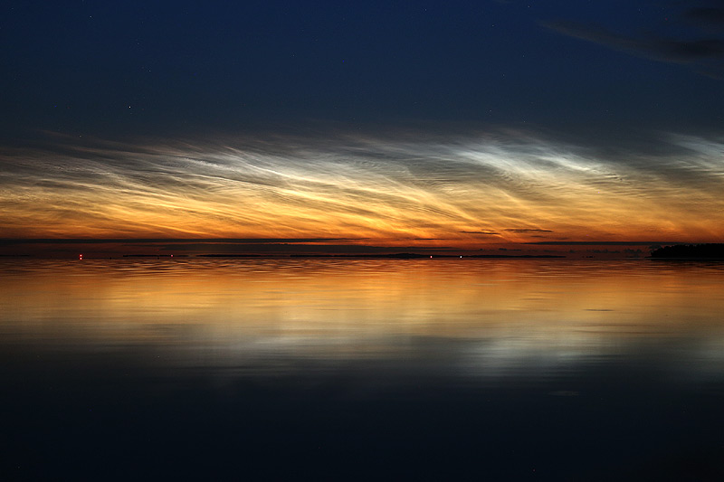 Ich hatte eigentlich erst ab 02:45 mit dem möglichen Auftreten von ersten Leuchtenden Nachtwolken auf den örtlichen Webcams gerechnet, da erst dann ein Sonnenstand von 16° unter dem Horizont zu erwarten war, aber die NLC tauchten bereits um 02:20 als erste Striche dort auf und waren bereits um 02:30 deutlich sichtbar, weshalb ich mein Essen vom Herd nahm und mich so schnell wie möglich anzog, einen Alarmstart machte und so schnell es geht zur Nordmole geradelt bin.