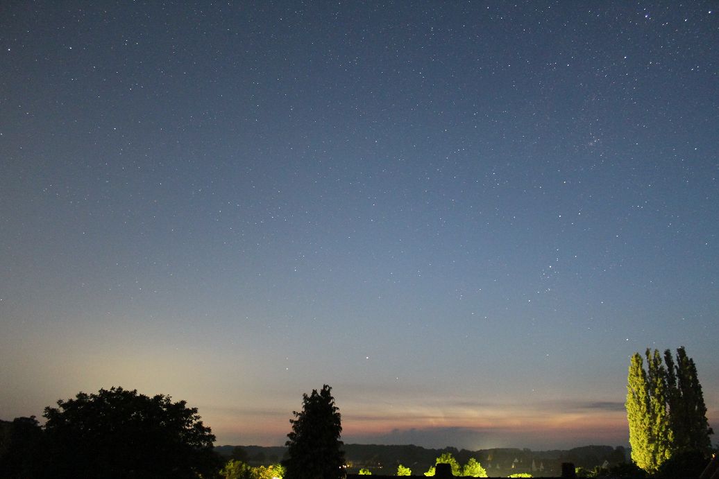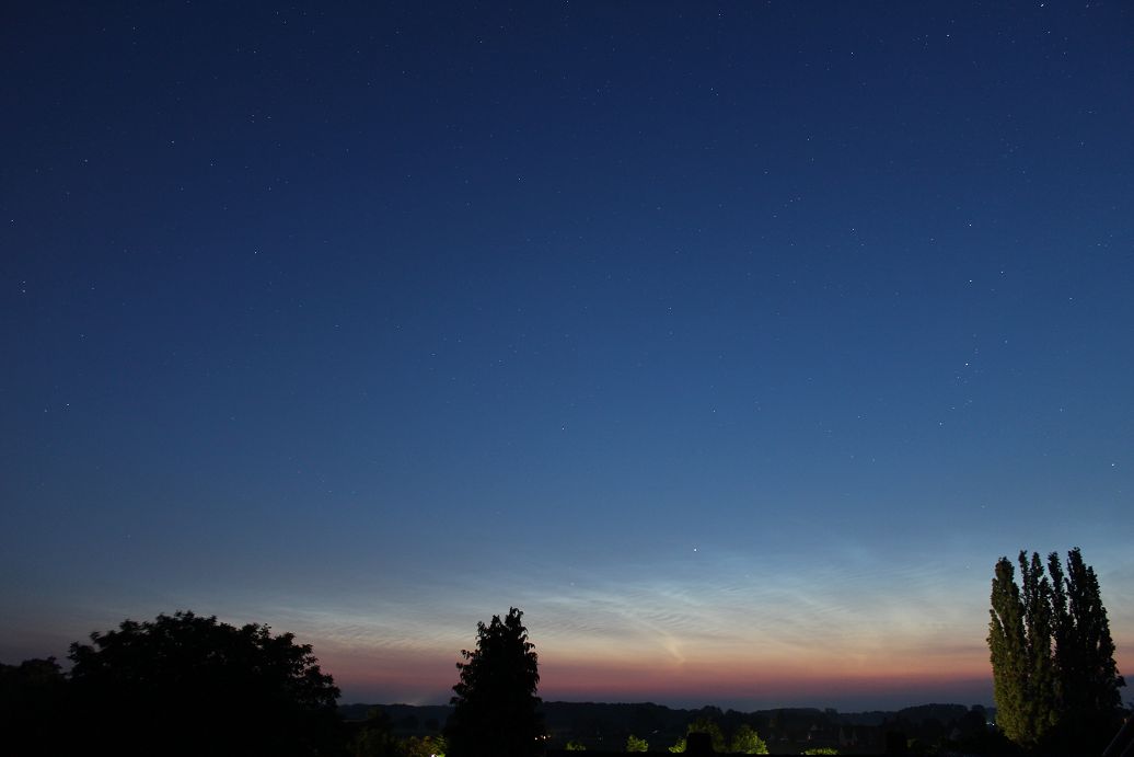 Tja, der abendliche Blick gen Himmel, auf der Südseite vom Wiehengebirge, war geprägt von dem Gedanken, dass ich ja beruhigt schlafen gehen könnte. Schließlich zierten allerhand troposphärische Wolken das Himmelsbild. Meine Dachkamera im Netzwerkbetrieb, positioniert bei Lübbecke und entsprechend auf der Nordseite vom Wiehengebirge, zeigte mir dann ab ca. 2 Uhr (MESZ) Anzeichen für ein überraschendes NLC-Morgendisplay. Mittlerweile war der Himmel frei von Wolken. Diese ersten zarten NLC-Strukturen wandelten sich ab etwa 02:30 MESZ in ein beeindruckendes Gesamtbild: