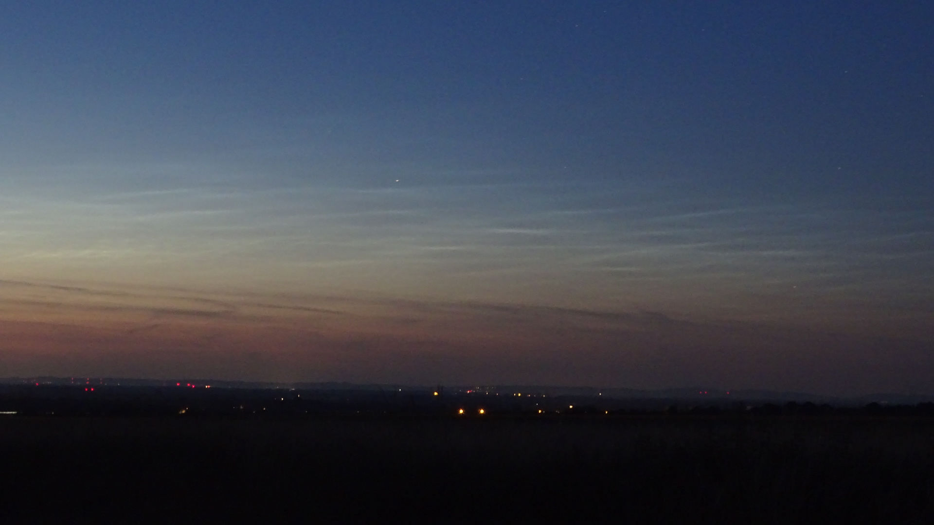 hier zwei Bilder von 21:22 und 21:28 UTC aus Hamburg. Auch gut erkennbar, dass die Zirren (die oberen zwei Drittel des ersten Bildes) teils ähnliche Strukturen wie die NLC aufwiesen. Deswegen war die Unterscheidung zunächst schwierig. Blickrichtung ist etwa NNO bis NO. Die NLC reichten bis etwa 12 Grad hoch und hatten visuell die Helligkeit 2-3.
