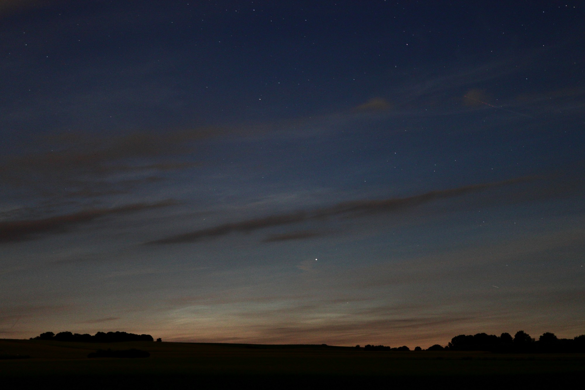 auch in Wardenburg ließen sich die Leuchtenden Nachtwolken beobachten. Allerdings war es gerade Richtung Norden nicht einfach, da ein Wolkenband die Sicht behinderte. Zum Glück waren die NLC so hell, dass sie sich deutlich von den Cirren abhoben.