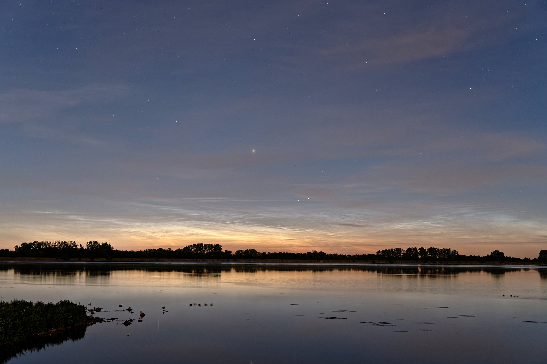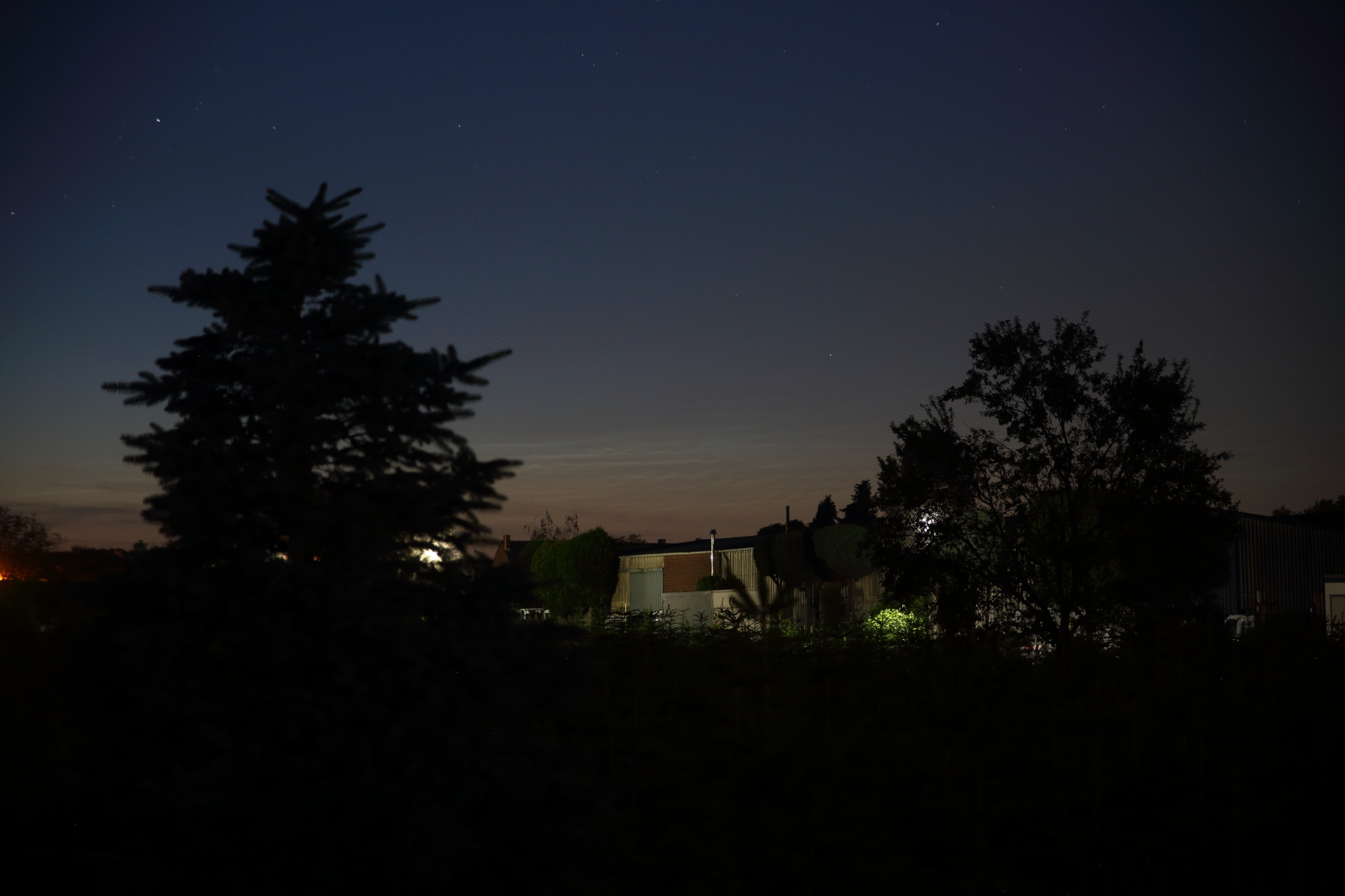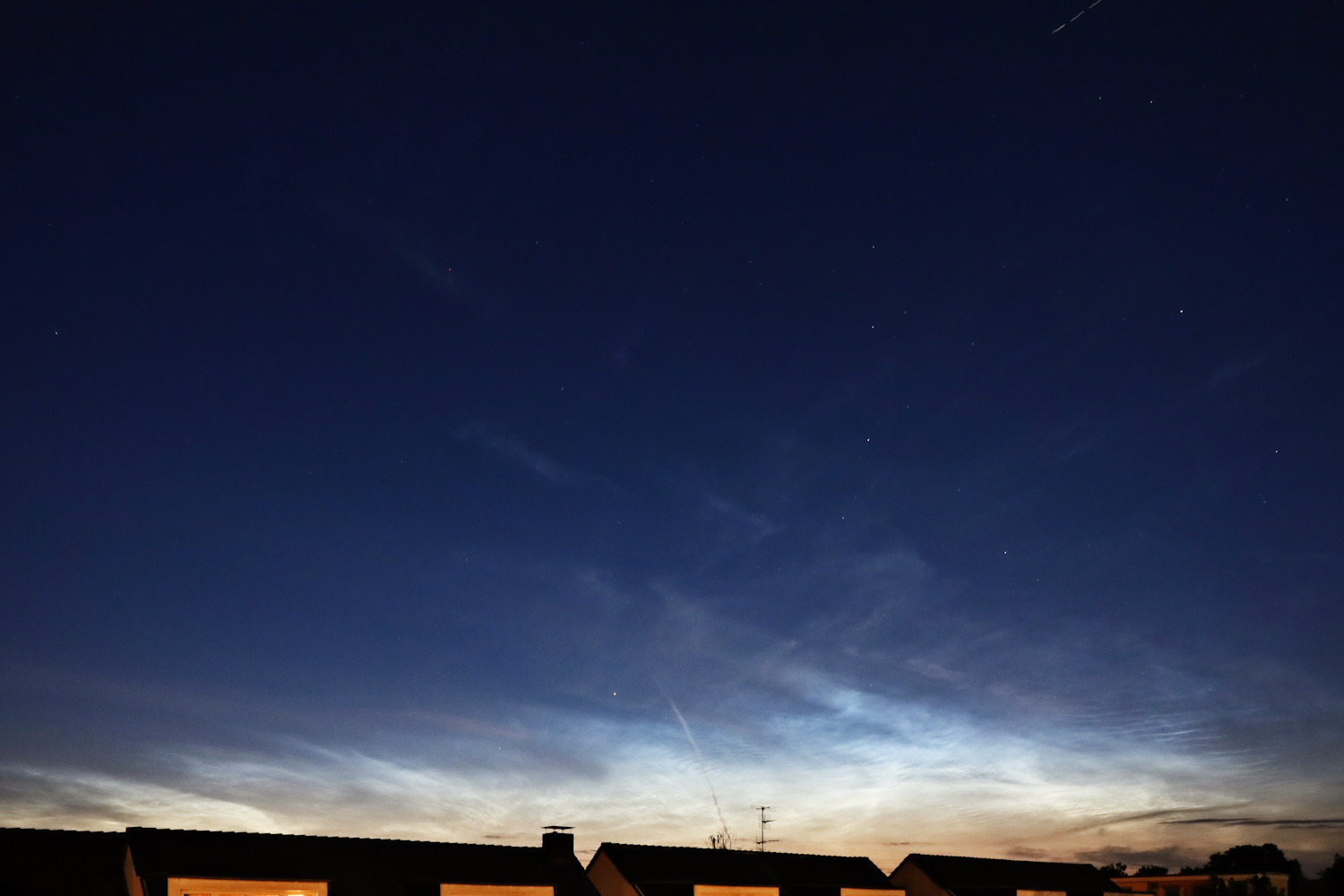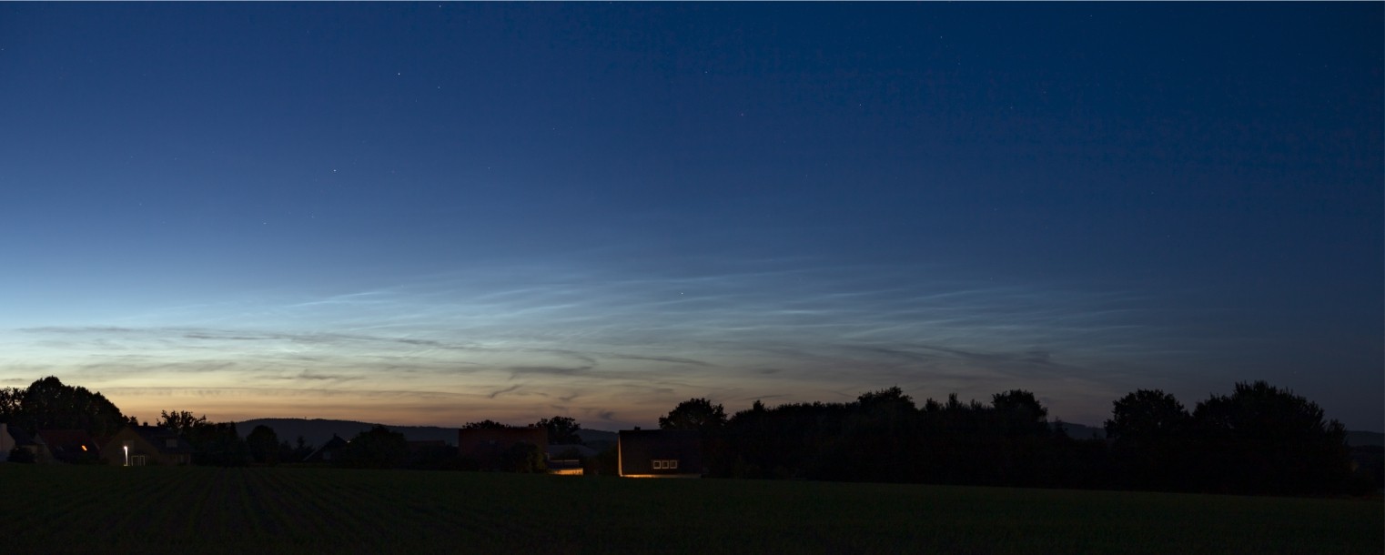 Im Anschluss ging es dann aber ins Bett. Eigentlich mit dem Vorhaben, den Morgensektor ebenfalls zu beobachten, allerdings sollte es anders kommen. Die hiesigen NLCs der Helligkeit 4-5 (?) habe ich gezielt verschlafen, meine Dachkamera (in 9km Entfernung) lieferte am Morgen danach eindrucksvolle Bilder: